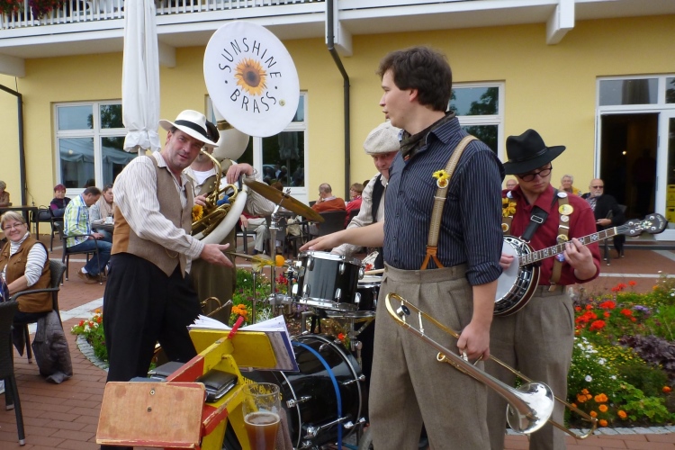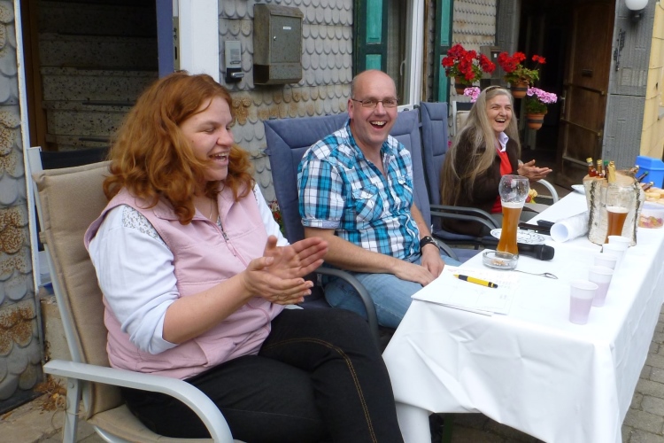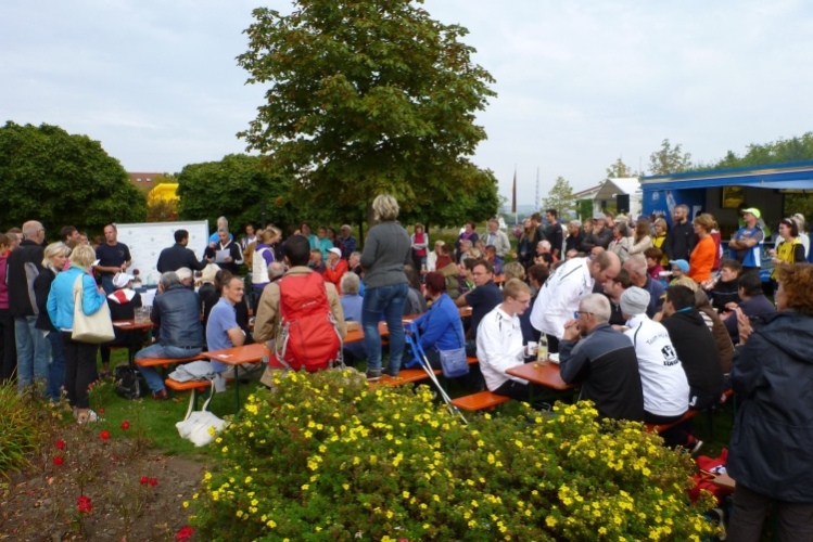 Zur Siegerehrung ist der Biergarten bestens besucht. Dann hocken Patienten, Sportler und Betreuer am Tisch und fachsimpeln über das Rennen.