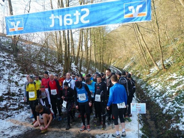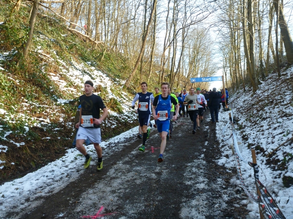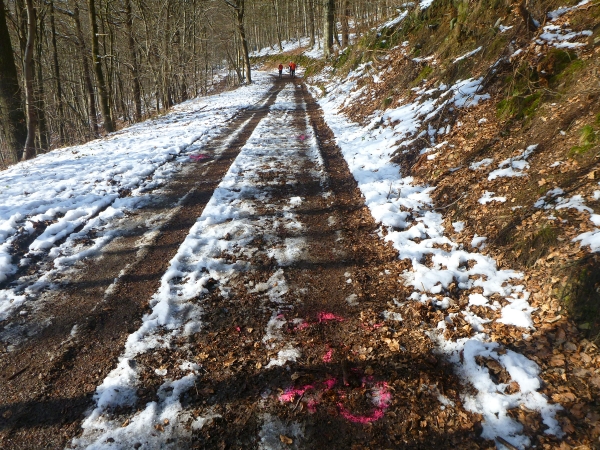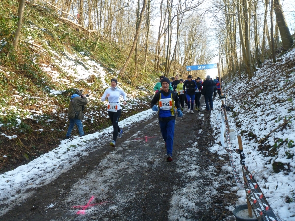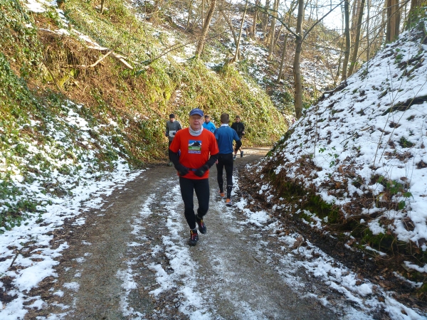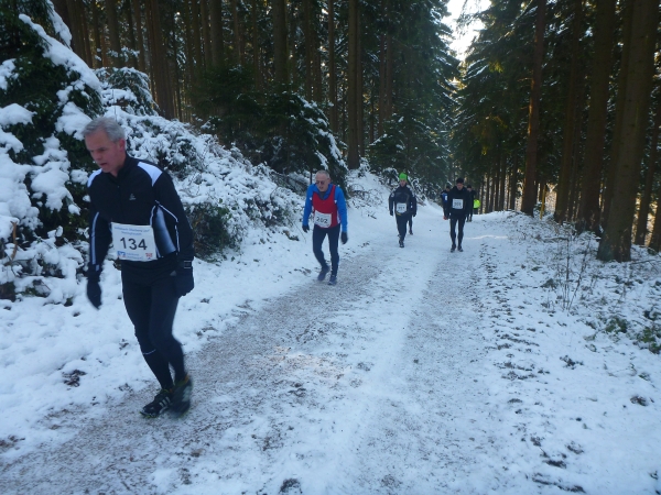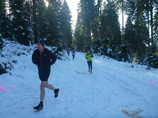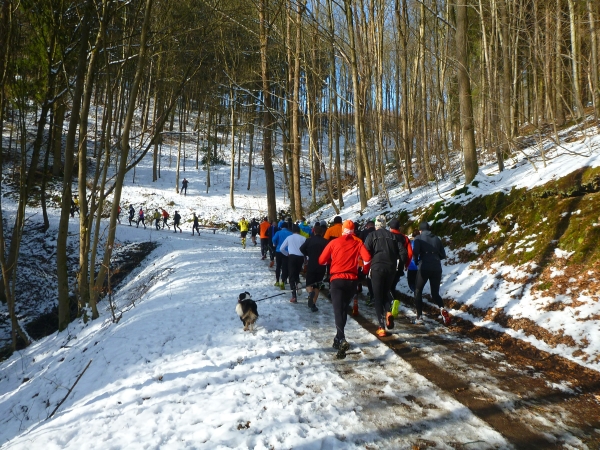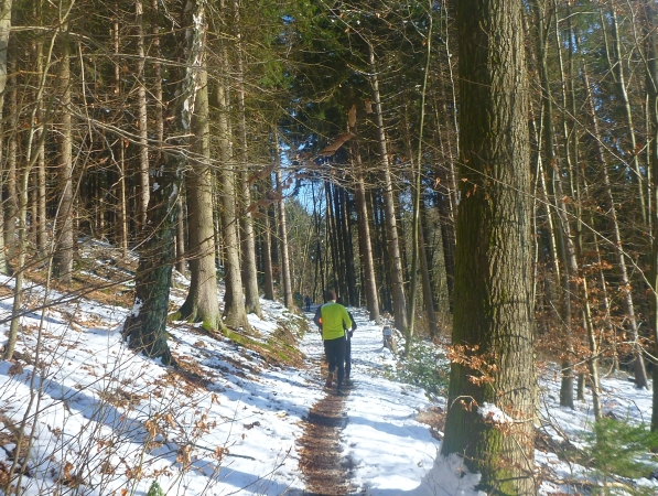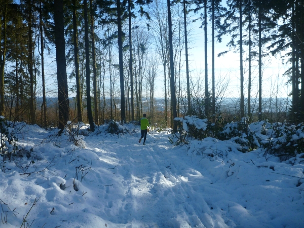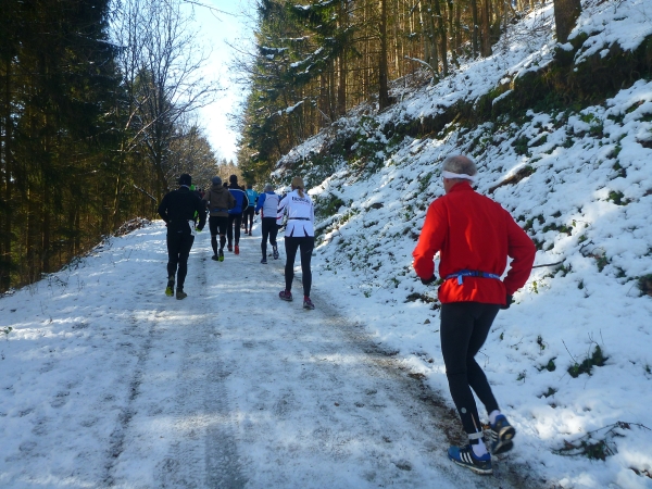 Der breite Forstweg hinauf lässt sich bergauf aber gut laufen. Die Läuferschar zieht sich rasch auseinander. Ich halte mich zunächst zurück und genieße die schöne Winterlandschaft. Die Hänge sind verschneit, Schnee liegt auf den Bäumen. Es macht so richtig Spaß.