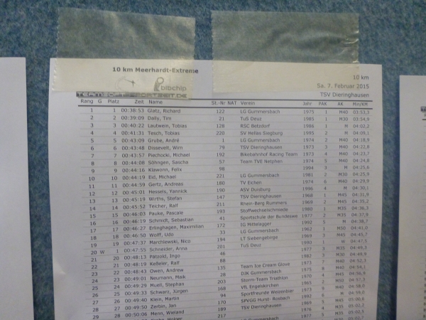 Nach der warmen Dusche lassen wir uns Kaffee, alkoholfreies Bier und Kuchen als erste Regenerationsmaßnahme schmecken. Die Siegerehrung steht an. Vorher wird ein Preis einer Engelskirchner Sportbekleidungsfirma mit 7 Buchstaben verlost. Er ist auf einen neuen Streckenrekord ausgelobt. Da Richrad Glatz diesen trotz hervorragender 38,53' aufgrund der Bodenverhältnisse nicht knacken konnte, wird er unter allen Läufern verlost.