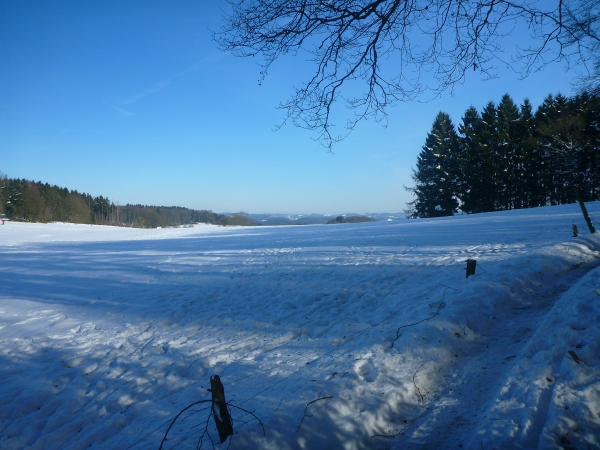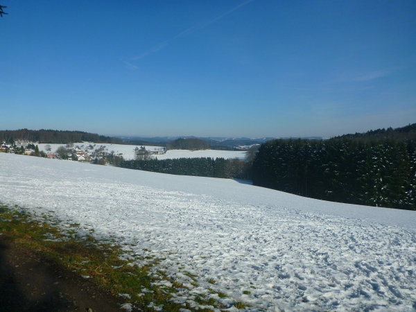 Ein wunderschönes Schneepanorama erwartet uns auf der Höhe. Die hügelige Landschaft ist komplett in Weiß gehüllt soweit das Auge reicht. Na, da hat sich die Mühe des Aufstieges doch gelohnt, denke ich. Dabei achte ich sehr auf den Weg. Bei diesen Bodenverhältnissen liegt man hier schneller auf dem Hosenboden als man denkt.