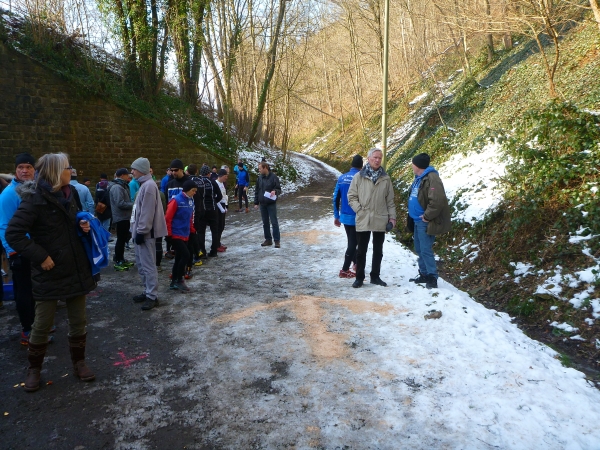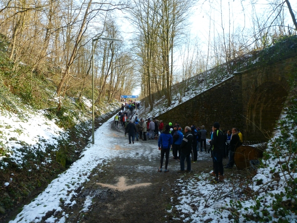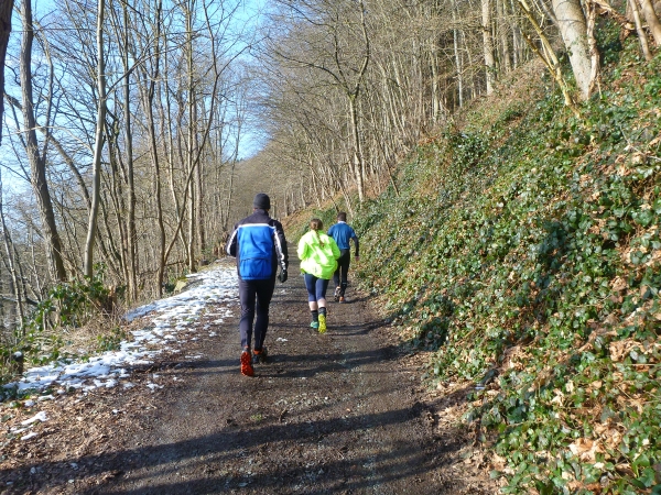 Aber der Lauf ist noch nicht zu Ende. 7 Km sind erst gelaufen. Es steht eine 3 Km-Schleife an. Vom Start führt die Strecke entlang der Gleise der RB 25 Marienheide-Köln. Wieder geht es aufwärts. Zunächst nur ein wenig, dann immer mehr. Hier unten hat es auch einigen Matsch. Der wandelt sich wieder in glattes Schnee/Eisgeläuf, als wir im Wald oberhalb von Brunohl laufen.