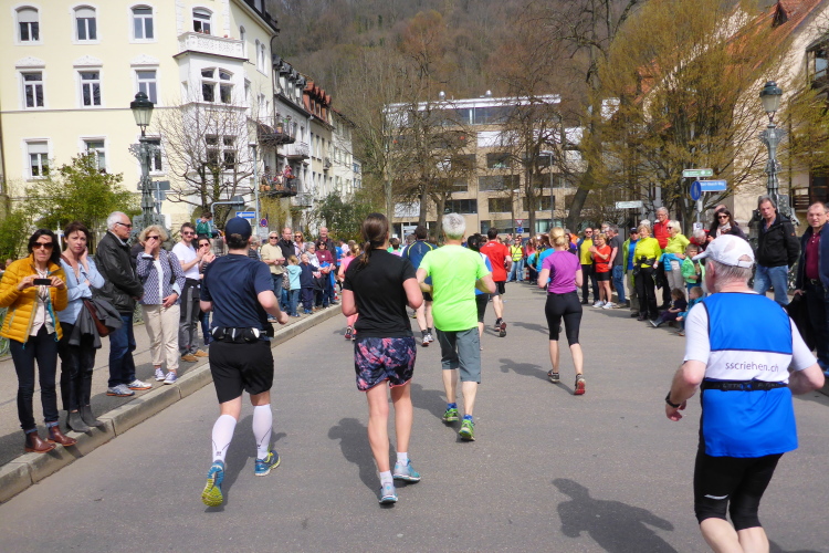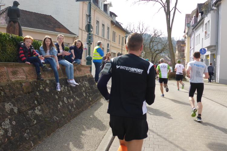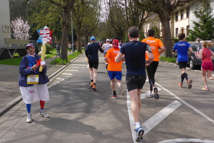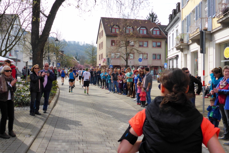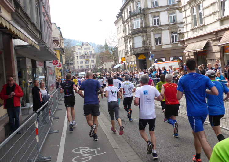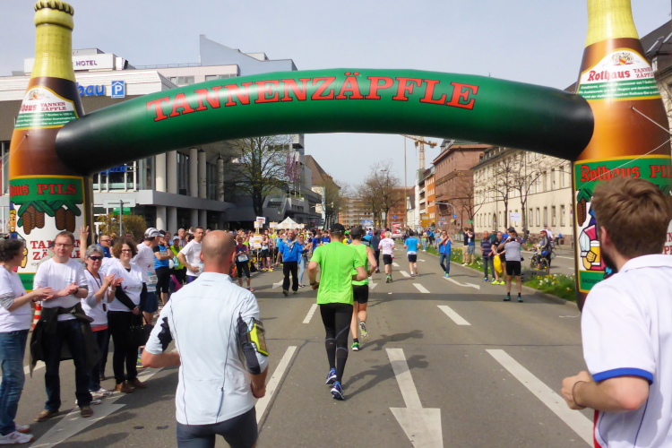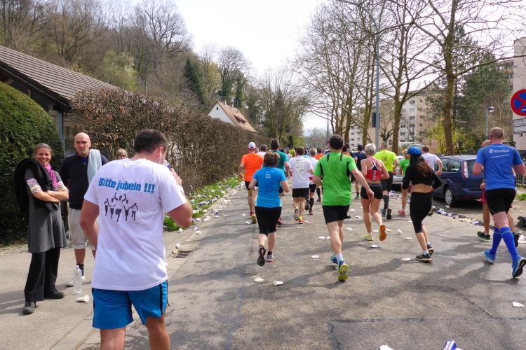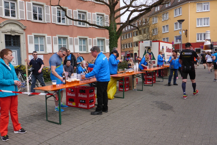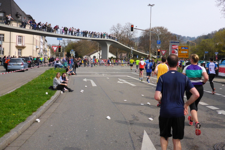 Auf der Beubarungsstraße spielt die Band „Silhoutte Dream“, obendrüber steht „Getränke Brüstle“. Den Namen kann ich mir gut merken. Hier sehe ich auch Pumuckl das letzte Mal. Er bleibt am Brüstle (neutrum!) hängen, ich glaube sie heißt Kerstin. Wieder passend: Vor mir läuft eine junge Hebamme, „Lolle“ wird sie genannt. Ich lese den Text und grinse meinem Laufkumpel rechts zu. Der aber hat sichtlich zu kämpfen und kann nicht mehr lachen. Dann gibt es Bier, Rothaus Bier, alkoholfrei. Na also, geht doch!