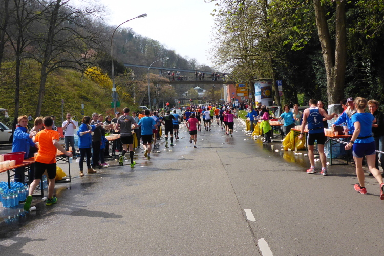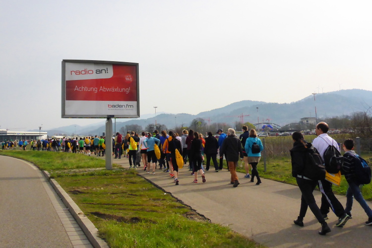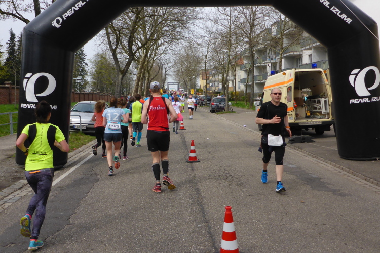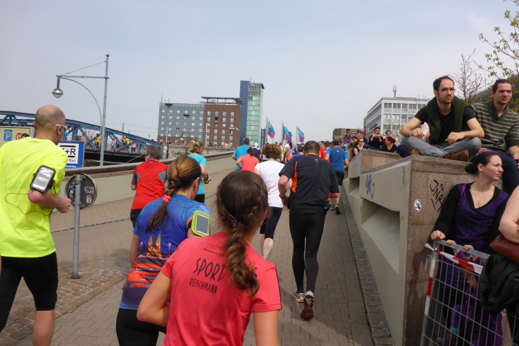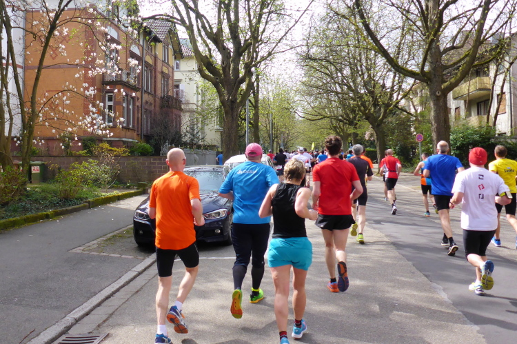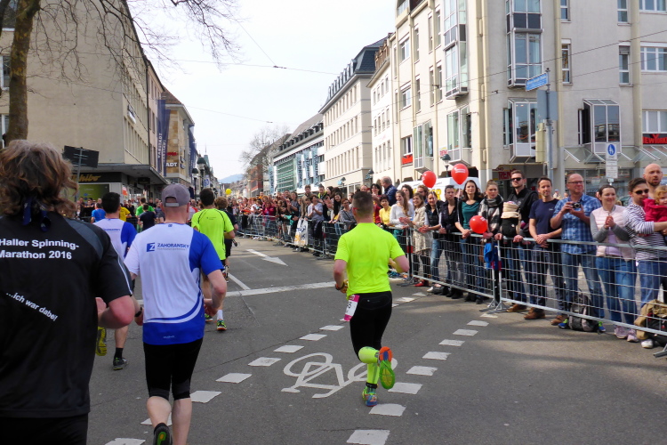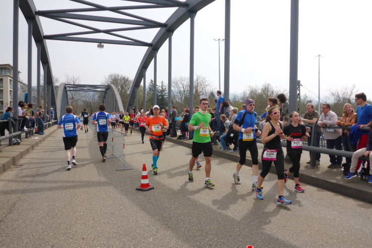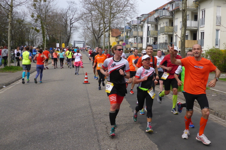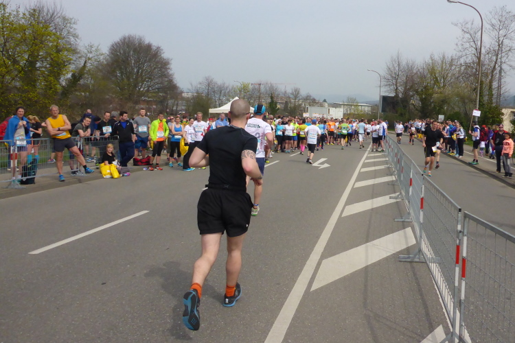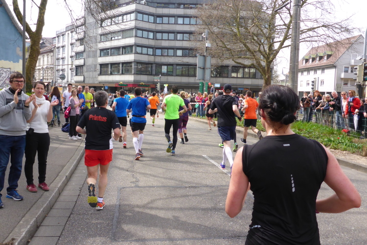 Die Brücke über die Gleise an der Kaiserstuhlstraße ist ein letzter Stimmungshöhepunkt, links läuft jetzt der Großteil der jungen Läufer den Halben zu Ende, rechts ist noch eine belebte Staffelwechselstelle. Da muss ich mich durcharbeiten und bin endlich in meiner stillen, einsamen zweiten Runde.