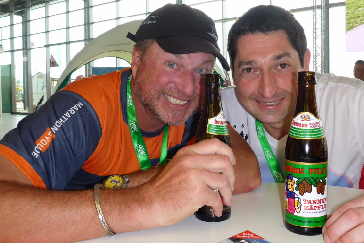 Lob an die Jugend: Hier gibt es Verbindungshäuser und ein Burschenschaftler ist „früh“ aufgestanden, um uns mit einem Kasten warmen Ö-Bier auszuhelfen. Im Ziel haben sich die alten Knacker bei mir ausgeheult: „ Ich dachte, ich schlage erst in der zweiten Runde zu, aber da war der Kasten Bier schon leer!“