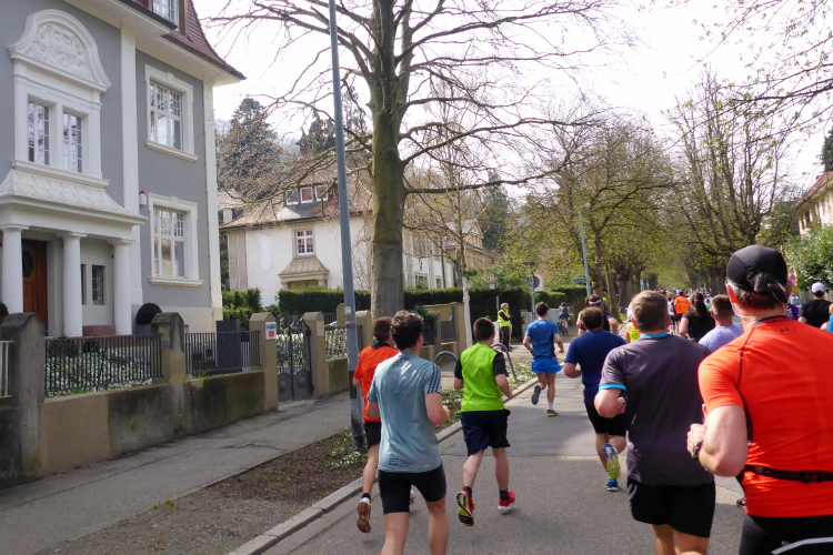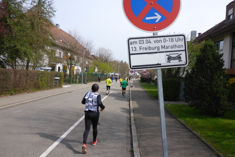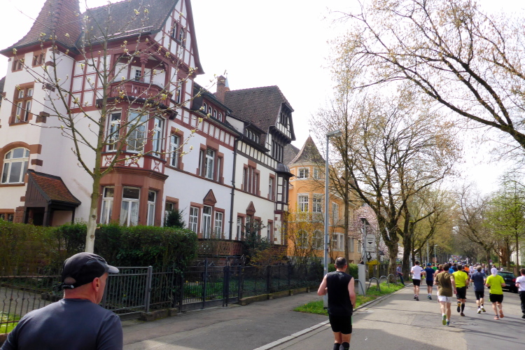 Ein Strassenschild bei km 6 aus Emaille, in Süterlin geschrieben, weckt meine Aufmerksamkeit: Tivolistraße, Ecke Mozartstraße. Wir sind im schönen Stadtteil Neuburg, was kaum ein Freiburger kennt, weil sie es zu Herdern rechnen. Jedenfalls hat man die alten Jugendstilhäuser wiederaufgebaut. Typisch sind die riesigen Magnolienbäumen und die zartrosa Kirschblüten. Hier kann man sich wohl fühlen.