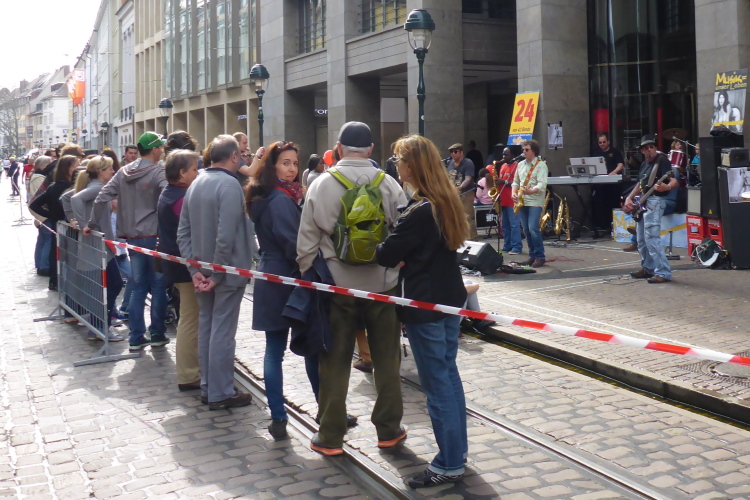 Zunächst geht es direkt auf den alten Zollhof am Güterbahnhof zu. Letzter Lichtblick, denn auf dem folgenden Gelände wird schwer gebaut. Danach aber geht’s vorbei am Holzofenhaus, wo Band Nr 4 spielt. Man muss aufpassen, daß man nicht das Kilometerschild mit der Nummerierung der Bands verwechselt. Hier also die Band „Abracadabra“. Noch sieben Tage habt Ihr Zeit, die beste Band zu voten (www.marathon-freiburg.com/voting). Aber wartet noch, ich habe einen Tipp.