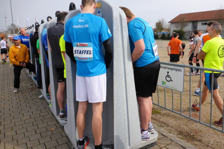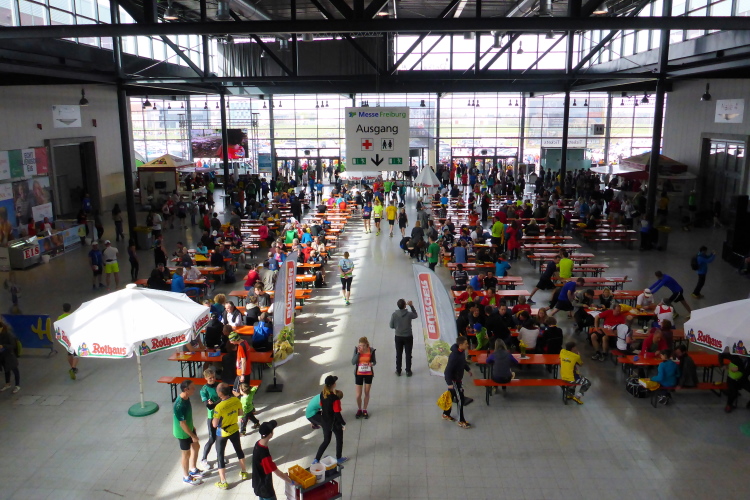 „Über 100 Flüchtlinge helfen bei der Startnummernausgabe und an den Verpflegungsstellen“, so heißt es in der Pressemitteilung des Freiburg Marathons. Tatsächlich muss ich jetzt die jungen Helfer loben. Hier ist das jüngste Helferteam versammelt, das ich je bei einem Marathon erlebt habe! Die Nachmeldung geht ruckzuck, man gibt dafür selbst seine Daten im PC ein, und erhält eine Startnummer mit Namensaufdruck. Bei der Kleiderbeutelabgabe werde ich eingehend gemustert: „Ich will nur sicher gehen, daß Startnummer und Chip befestigt sind“ sagt die junge Dame, solche Fürsorge ist auch neu für mich.