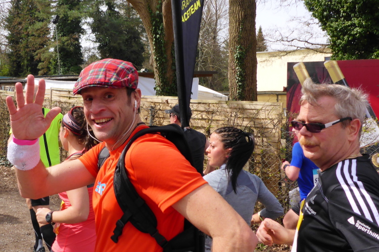 Der Schnellste ist Pumuckl heute nicht, eben er schon wieder. Und zwar vor dem Hostel, in dem wir übernachtet haben. Noch ehe wir unsere Heldentaten der letzten Nacht besprochen haben, ziehen die 3:30er Pacemaker vorbei. Eigentlich ziehen alle vorbei. Also fetze ich wieder los. Das geht bis km 11 gut, dann zieht schon Martin der 4:00 Std Pacer an mir vorbei. Er läuft wie immer im Schottenrock, was ihm bei diesen frühlingshaften Temperaturen den entscheidenen Vorsprung vor dem Pace-Kollegen Zeljko bringt, der mich erst bei km 12 überholen kann - direkt vor dem zugesprayten Blitzerautomaten. Egal, ich habe endlich wieder eine gute 10 km-Zeit und das baut mich auf. Es werden Zeiten kommen, da versäge ich Euch alle!