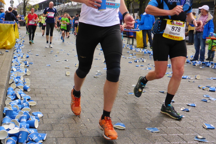 Fies, ganz fies ist der riesige Schwenkgrill mitten auf unserer Laufstrecke. Lieber Gernot, es mag sein, dass es in München, deinem zweiten Orgarevier, ungegrillte Weißwurst an der Strecke gibt. Aber entweder es gibt hier Steaks für die Läufer an der Strecke, oder der Griller kriegt die Auflage für ne Dunstabzugshaube. Ich bin auch nur ein Mensch und halb verhungert. Alles was mir jetzt angeboten wird, sind Bananenstücke! Ich laufe jedes Wochenende, muss bei Kräften bleiben. Aber abgesehen davon ist Dein Lauf absolut top!