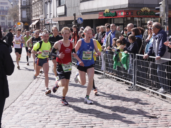 Auf meinem letzten Kilometer kommt mir das hintere Feld des Marathons entgegen. Gut sehen sie aus, die Jungs. Ich hätte zwar schon noch Luft und Lust, aber nicht für noch einmal 21 km. Demnächst vielleicht, heute nicht.