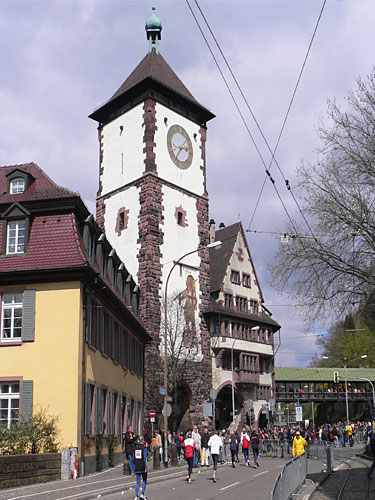 Die Steigung hinauf zur Wiwili-Brücke spüre jetzt doch deutlich in den Beinen. Aber die Zuschauer treiben auch mich weiter. Schade, vom Freiburger Münster ist nur die Spitze zu sehen. Der Bereich um das Münster mit seinen engen Gassen und dem „Bächle“ ist aber für einen Lauf in dieser Größenordnung nicht „geeignet“.