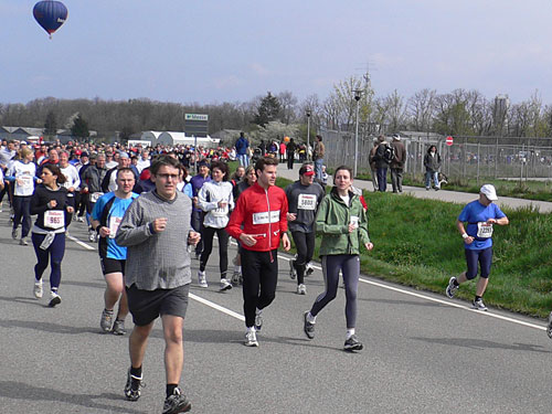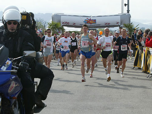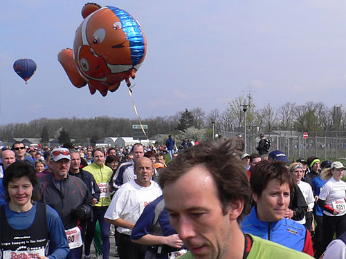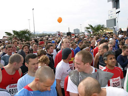 Vor dem Start herrscht in der Messehalle mit der Startnummernausgabe zeitweise beängstigende Enge. Weil es draußen noch ziemlich frisch ist, suchen auch die Leute, die mit ihren Startunterlagen schon versorgt sind, ein warmes Plätzchen. Es geht gegen 11:00 Uhr und die Startblöcke füllen sich. Es herrscht die übliche Nervosität und jeder informiert sich beim Nächsten über Strecke und Zielzeit. Auffallend ist, dass sehr viele junge Leute am Start sind. Wahrscheinlich etliche Studenten darunter, von denen Freiburg ja über 30.000 beherbergt. Aber auch aus der Schweiz und dem benachbarten Elsaß sind viele Teilnehmer angereist.