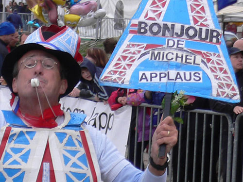 Dann die Show des Michel Descombes, dem Marathon-Paradiesvogel aus Frankreich, dem man seine mittlerweile 63 Jahre nicht ansieht. Er hat über 140 Marathon-Läufe absolviert, ist immer kostümiert und meist mit einem Baguette unterwegs. Traditionell nimmt er die letzten Läuferinnen und Läufer in Empfang und gratuliert ihnen. Ich sehe ihn bestimmt bald wieder.