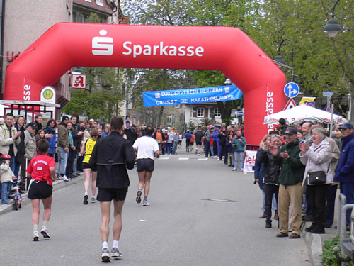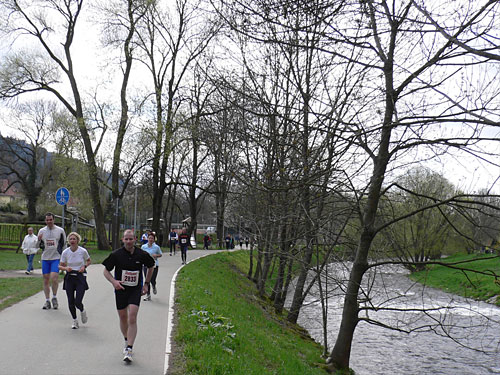 Um 11:05 fällt der Startschuß. Es dauert aber noch eine ganze Weile, bis sich auch im Block der über 4-Stunden-Läufer etwas tut und erst nach über 20 Minuten laufe auch ich über die Startlinie. Mit viel Applaus verabschiedet uns die großen Zuschauermenge. Eng geht es zu, erst als wir auf der Berliner Allee, der 4-spurigen Zufahrtstraße zur Messe sind, verteilt sich das riesige Läuferfeld. Wir sind noch keinen Kilometer gelaufen, spielt schon die erste von insgesamt 42 Musikgruppen auf. Auch hier stehen zahlreiche Zuschauer. Als wir nach ungefähr 3 Kilometer in die Haslacher Straße kommen, haben wir eine Trommlergruppe und mehrfach Rock- und auch Blasmusik gehört. Es wird wieder eng. Mir scheint, alle Anwohner stehen an der Straße und feuern uns an. Gut, dass ich hier nur dabei sein will und keine (für mich) schnelle Zeit laufen will. Der Laufrhythmus besteht nämlich aus Bremsen, Beschleunigen und Ausweichen.