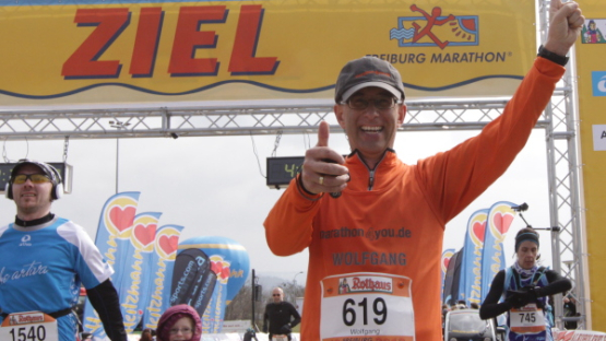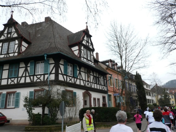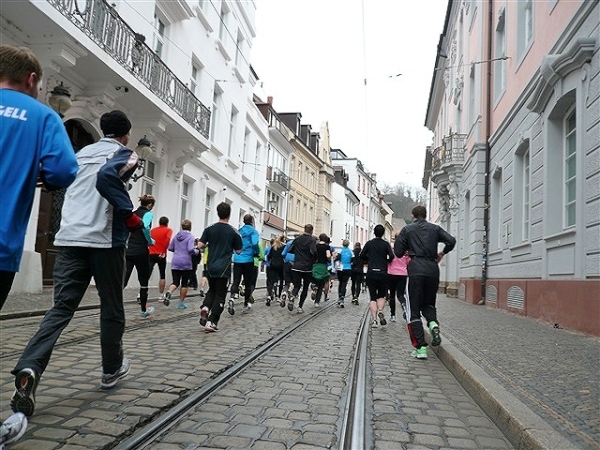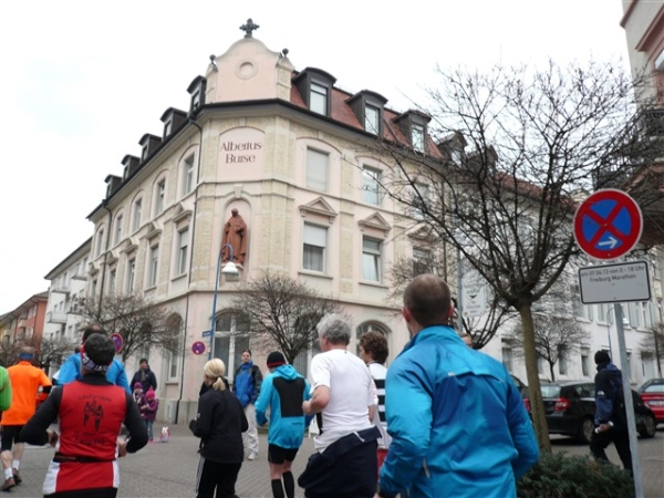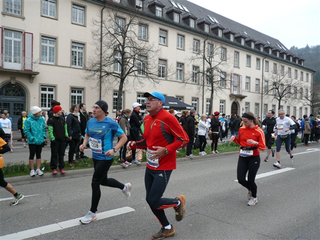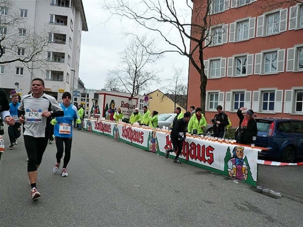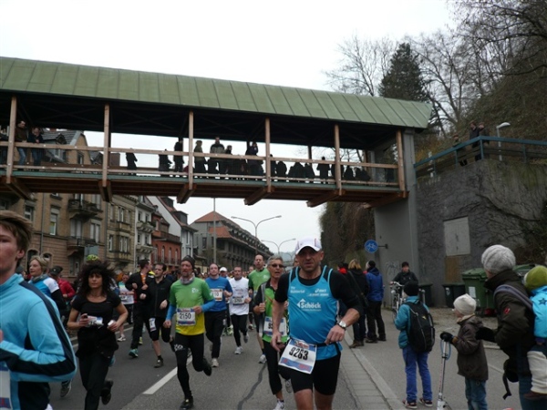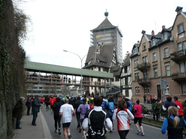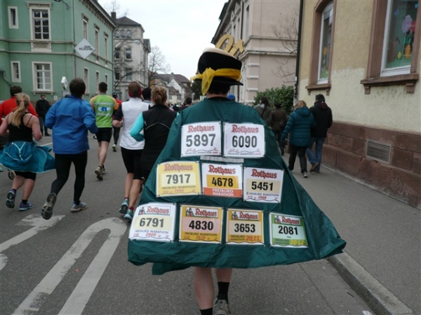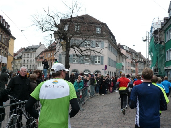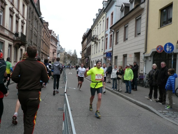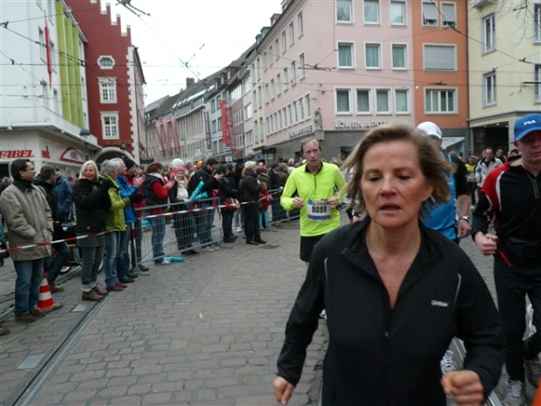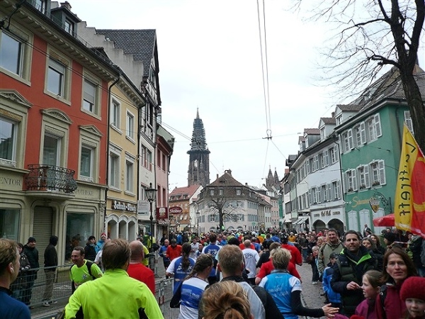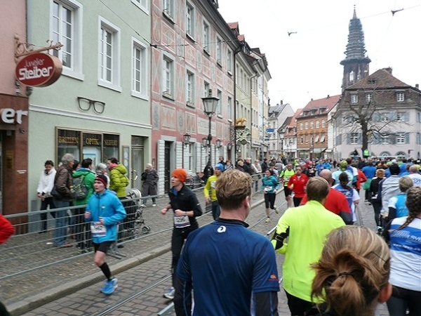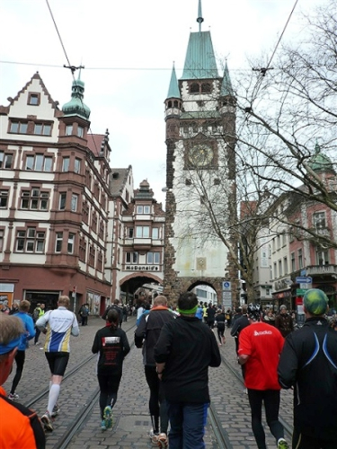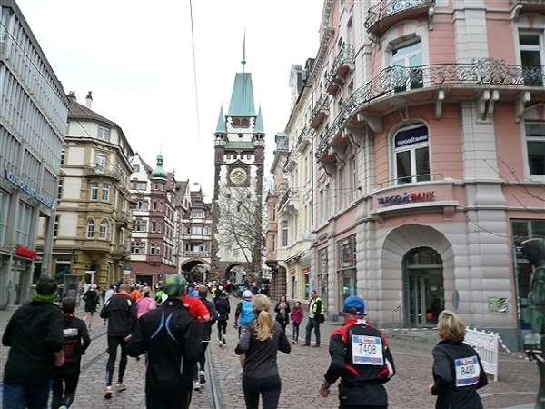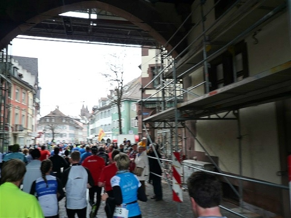 Der Laufclub 21 ist am Spendensammeln, trotzdem ist Peter Hübner nach 4:22 Std. im Ziel, Respekt! Den Pumuckl habe ich dieses Mal aber leider verpasst. Wie verlassen die Dreisam und kommen durch das eingerüstete Schwabentor in die Altstadt, jetzt wird’s haarig. Einerseits wunderschön durch etliche im Krieg unversehrt gebliebene Bürgerhäuser und guten Zuschauerzuspruch, andererseits wird der Straßenbelag echt übel: Grobe Kopfsteine mit teilweise löchrigen Zwischenräumen, gepaart mit Straßenbahnschienen, verlangen größte Aufmerksamkeit. Insbesondere auf der zweiten Hälfte wird das eine echte Herausforderung, ich muß dem Untergrund mehr Beachtung schenken, als ich will, und kann die Umgebung gar nicht so intensiv bewundern, wie ich möchte.