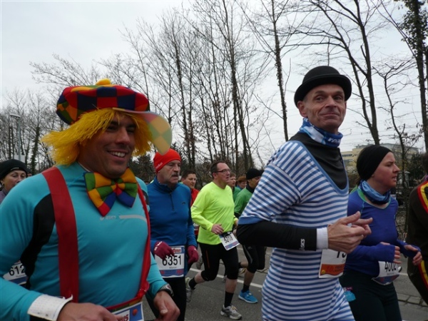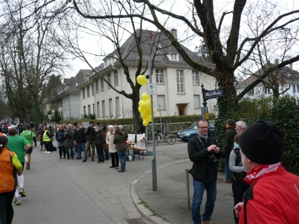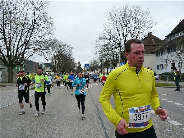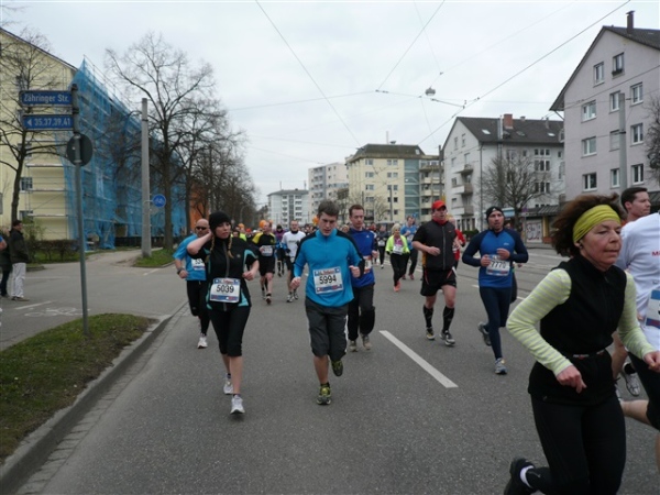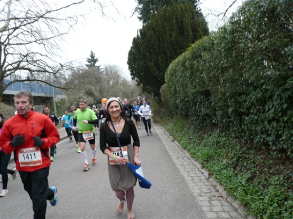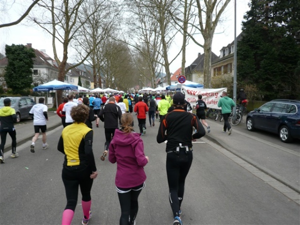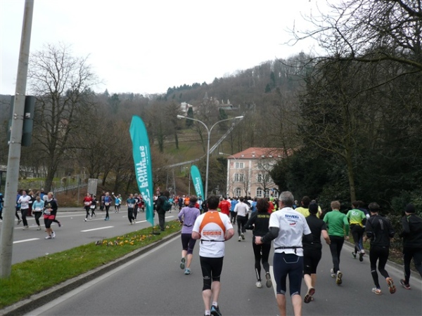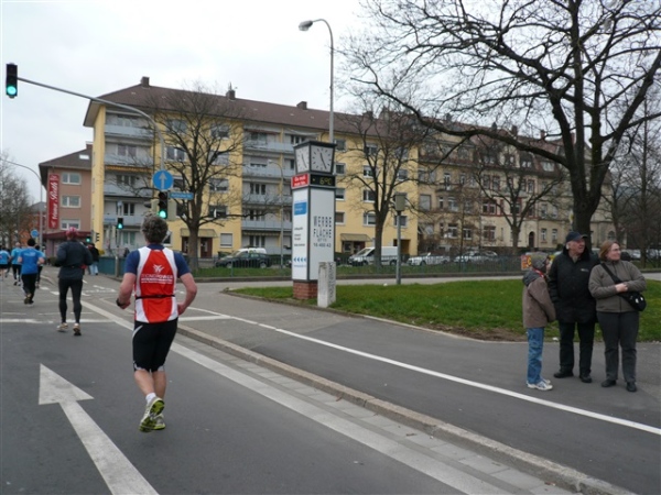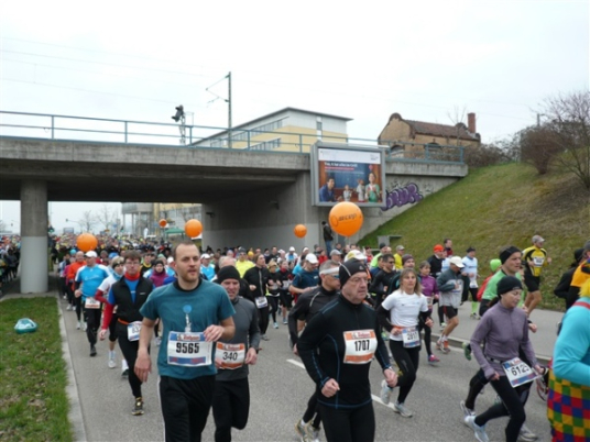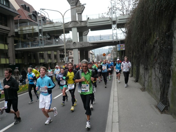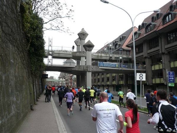 Unbestätigten Gerüchten zufolge soll es im Ausnahmefall in Freiburg auch schon mal Sonne und ein paar Wärmegrade geben, nur heute nicht. Sowohl auf der ersten, als auch auf der zweiten Runde habe ich Glück: Der auf den Schloßberg führende Schrägaufzug überquert, wie bestellt, auf einer Brücke just in dem Augenblick unsere Strecke, als ich darunter herlaufe. Dann, nach sieben km, kommen wir in die Innenstadt. Und es gibt sie tatsächlich: Dicke, fette Kroketten, die in den schönsten Farben auf dem mittleren Grünstreifen prangen, der Hin- und Rückweg voneinander trennt. Das wird heute nicht die letzte Begegnungsstrecke bleiben, allzu kreative Läufer hindert man durch eine geschickte Anordnung der Zeitmeßmatten erfolgreich an der Ausübung ihrer Untaten.
