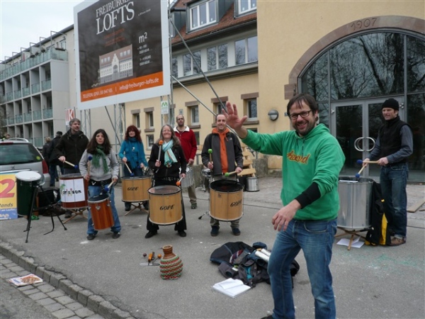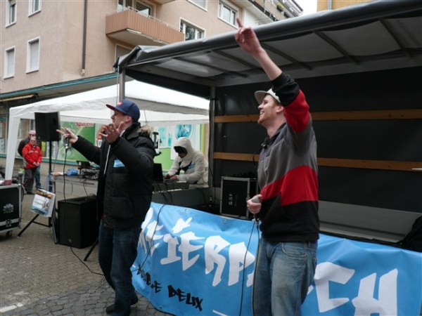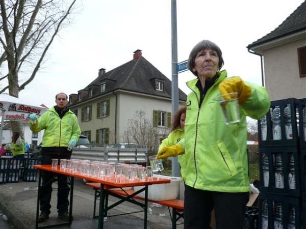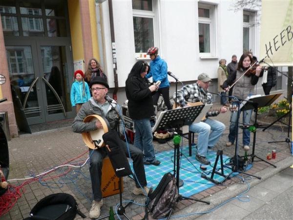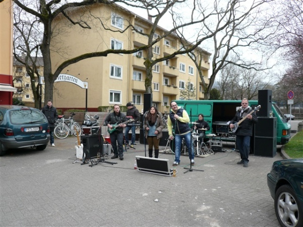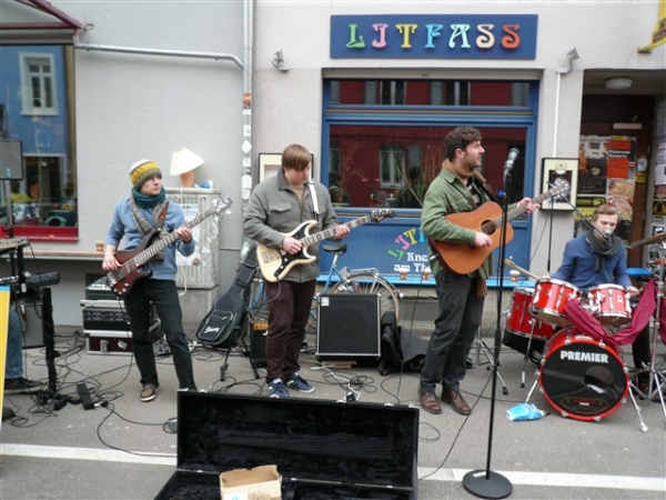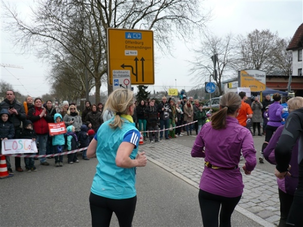 Baden ist, was Unterhaltung auf der Strecke betrifft, deutschlandweit führend. Ist Karlsruhe der Tanzmarathon schlechthin, sind hier 42 Bands zu unserer Unterhaltung auf 21 km verteilt, das zu dividieren sogar ich noch schaffe. Theoretisch erfolgt für mich also jeweils nach knapp drei Minuten ein musikalischer Ansporn, alle zu fotografieren bekomme ich allerdings nicht hin, denn ein wenig Laufrhythmus schadet ja auch nicht. Die erste Band, die ich entdecke, trägt die Nr. 3 von 42, offensichtlich befinden sich die ersten beiden noch im Tiefschlaf.