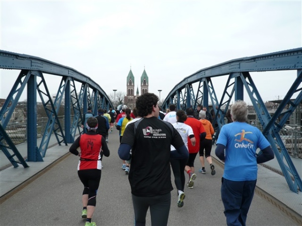 Das Symbol des Laufs schlechthin, zumindest in meinen Augen, erreichen wir kurz vor km 18: Die blaue Wiwili-Brücke über die Gleisanlagen. Der Name hat nichts mit GleichFerdinand oder ÄhnlichHubert zu tun, er kommt von der nicaraguanischen Partnergemeinde, in der zwei Freiburger während eines humanitären Hilfseinsatzes ermordet worden waren. Beeindruckend ist das sich mir bietende Bild, links und rechts blaue Stahlträger, geradeaus die Doppeltürme der Herz-Jesu-Kirche. Wirklich schön, dieses Foto hat auch mal den Titel eines unserer Printmagazine geziert.