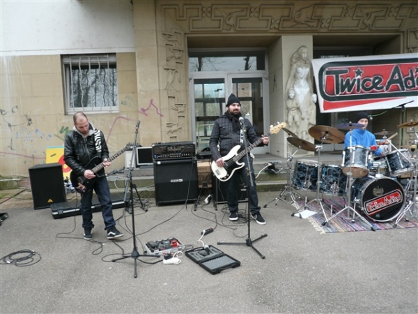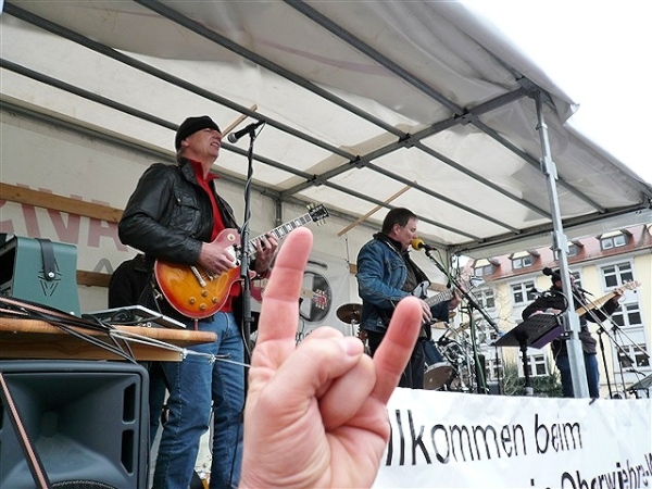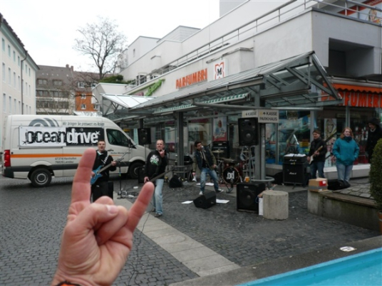 Weiter in der Innenstadt rummst es wieder einmal gewaltig: Der Rhythmus des Schwermetalls läßt einen älteren Herrn erneut nicht unbeeindruckt. „Heavy Metal for the battle“ sorgt doch für den einen oder anderen kurzen Stop im Laufgefecht, erst zum Fotografieren, dann zum Headbangen oder beides gleichzeitig. „Highway to hell“, „Hells Bells“, „Easy Livin’“, „Smoke on the water“ höre ich, leider nur im Vorbeilaufen, auch „Ballroom Blitz“ habe ich gefühlte 100 Jahre nicht mehr gehört. Gott sei’s geklagt, hier kennt mich keiner, ich kann mich also der Mucke hingeben. Vor dem Herrn Chefredakteur brauche ich mich auch nicht mehr zu schämen, nachdem er sich heute Morgen als AC/DC-Fan geoutet hat.