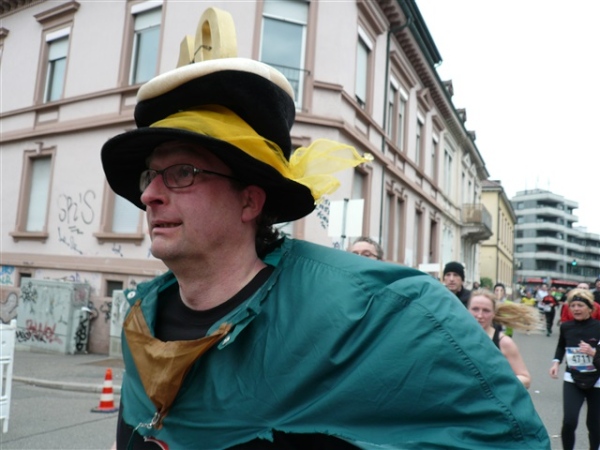Viel los ist immer an den Wechselstellen des S’Cool-Runs, dann laufe ich auf einen Helden auf. Neun Startnummern auf der Rückseite seines Umhangs weisen ihn als bald zehnfachen Finisher aus. Er ist so mit sich selbst beschäftigt, daß er nicht einmal mitbekommt, wie ich ihn von vorne aus nächster Nähe knipse.