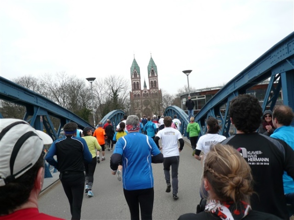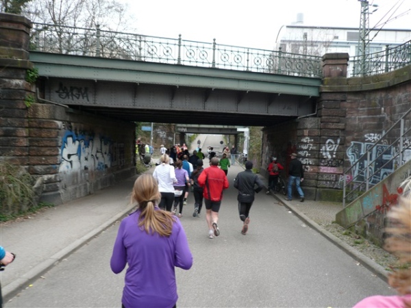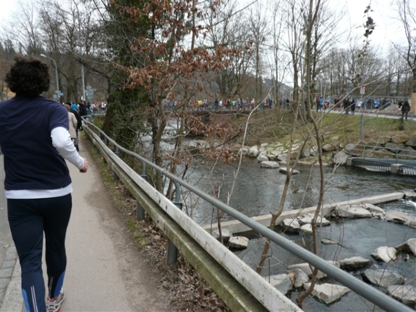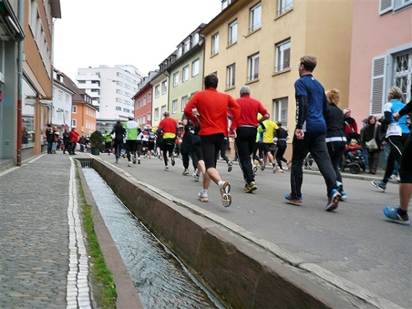Die unterquerte Schloßbergbrücke, einen Fußgängerübergang, zieren jede Menge Reliefs, die ich gerne betrachtet hätte, aber leider wird die Zeit nicht angehalten. Also weiter. Dann die nächste Begegnungsstrecke, am Rand derer die ersten Straßenbahnschienen liegen, die uns noch viel Verdruß bereiten werden. Eine Halbmarathonia wird spontan ein paar Meter von einer Freundin vom Streckenrand begleitet. „Oh je, hoffentlich darf man das?“ „Ach wo, das interessiert doch keinen!“ Vor allen Dingen, der laufende Reporter hat den Frevel bereits bildlich eingefangen. Dann entdecke ich ein vergleichsweises Rinnsal, an dem wir entlanglaufen. Das wird doch nicht etwa? Tatsächlich, es ist die Dreisam. Irgendwie hatte ich mehr erwartet. Warum, weiß ich auch nicht, vielleicht, weil man „Dreisam-Stadion“ so oft hört? 180°-Kehre und auf der anderen Seite wieder zurück.