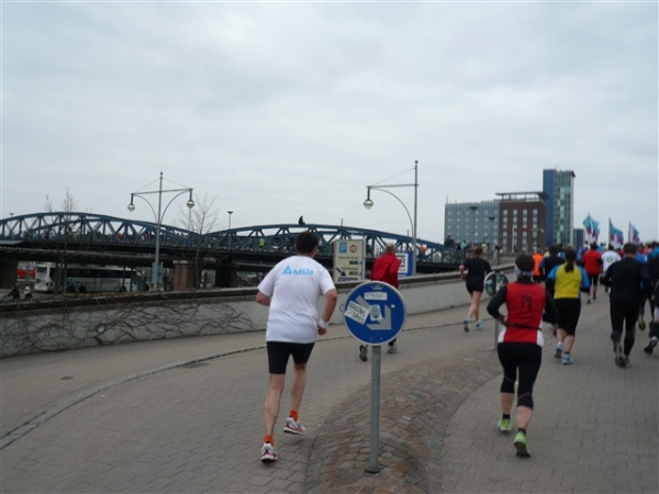 Dann geht es fast schon auf die Zielgerade, drei km durch nicht ganz so aufregendes Gebiet sind noch zu absolvieren. Erfreulicherweise haben die Bands an der Strecke noch Schwung, dann teilt sich das Feld am Ende der letzten Brücke. Allerdings sehr ungleichmäßig, denn mehr als fünfmal so viele Halbmarathonläufer biegen nach rechts ab als wir Bescheuerten, die meinen, nach links und damit noch eine zweite Runde laufen zu müssen. Gut, daß mich der Chef heute früh nochmal daran erinnert hatte, sonst wäre ich aus Versehen rechts abgebogen!