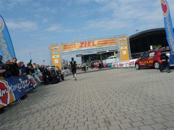 Egal, mit 3:58 ungerade habe ich mich nochmal unter vier Stunden ins Ziel gerettet und werde zur Belohnung von Klaus abgelichtet. Kurz danach kommt, auch noch mit einer „3“ vorne, Patric Marquart ins Ziel. „Ich weiß gar nicht, wie ich das anstelle, manchmal vierzig Minuten schneller einzulaufen!“ Das beruhigt, da war ich heute doch nicht als einziger am Kämpfen.