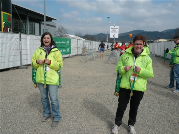 Als ich im Ziel bin, reißt der Himmel auf. Na, da wird mir doch wenigstens der Abschied noch ein wenig versüßt. Eine schöne Jubiläumsmedaille gibt’s und dann reißen sich noch einige Mädels mit Wärmefolien um mich. „Ihr seht ja noch besser aus als die Medaillen!“ sage ich und ernte strahlendes Lächeln.