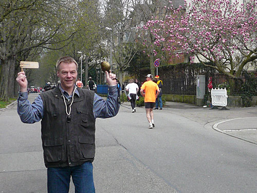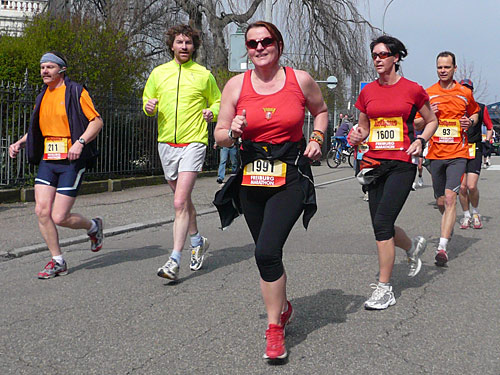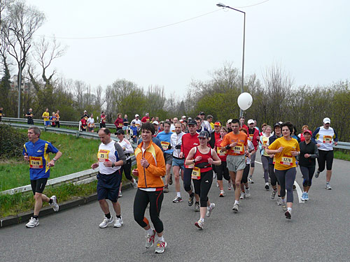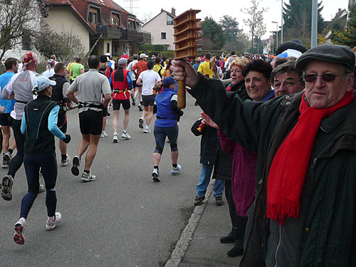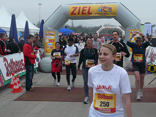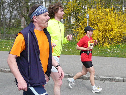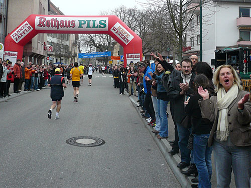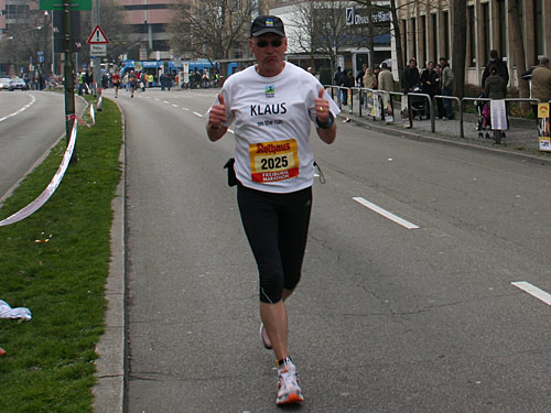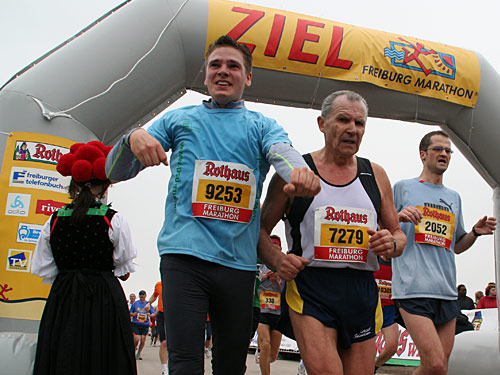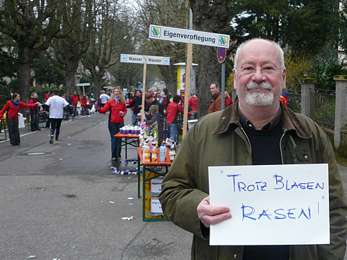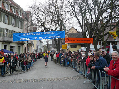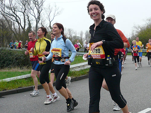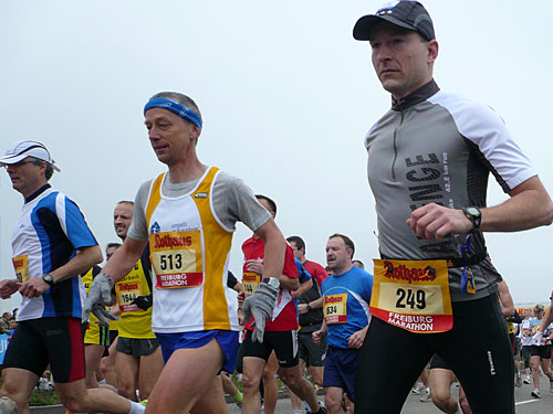 Am Samstag hat der Winter noch einmal seinen Auftritt, es schneit im Schwarzwald und die Temperaturen sind so weit gesunken, dass sich sogar in der Rheinebene Schnee und Regen vermischen. Mehr passiert nicht, in Freiburg ist Marathon, und da ist schönes Wetter inklusive. Der versprochene Sonnenschein bleibt allerdings aus, der Nebel hält sich zäh und nur manchmal kommt vereinzelt die Sonne durch. Die Temperaturen liegen bei 15 Grad, ideal also zum Laufen.