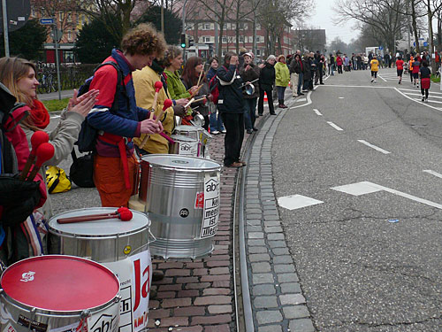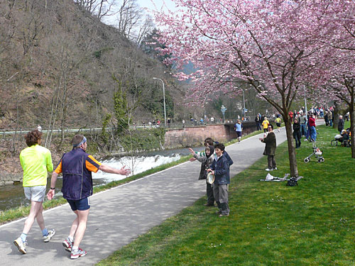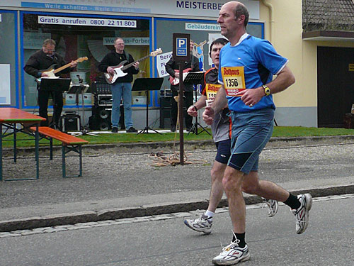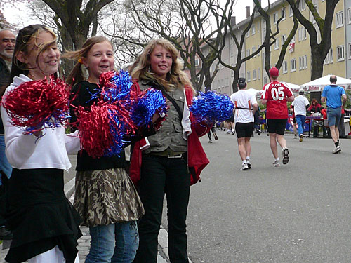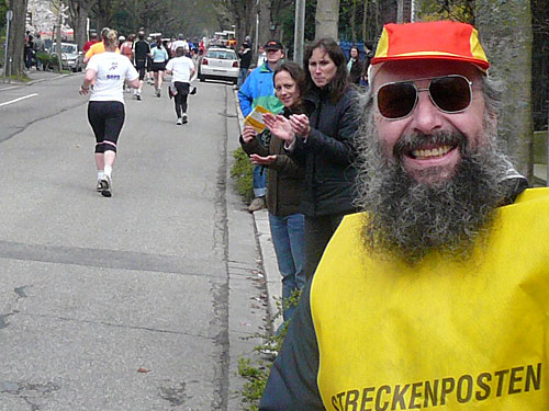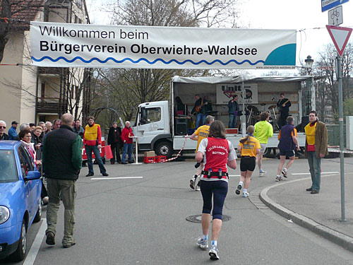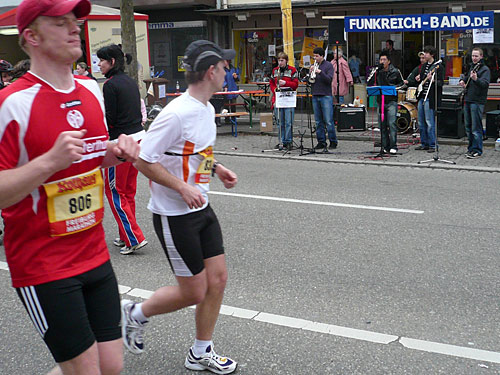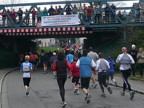 Auch die Musiker sind noch frisch und unverbraucht und gehen engagiert zur Sache. Als es nach gut 2 Kilometern über die Zubringerbrücke geht und sich die Fahrbahn verengt, hat sich das Feld längst auseinander gezogen und jeder läuft ungestört „seinen Stiefel“. Alleine 4, vielleicht auch 5 Musikgruppen sind auf die Haslacher Straße verteilt, einem Wohnviertel, das ab den 60er Jahren entstanden ist. Die Anwohner hält es nicht in ihren Häusern, sie stehen an der Straße und feuern die Marathonis an. „Ist nicht mehr weit“, meint einer, der wohl glaubt, die erste Runde verschlafen zu haben.