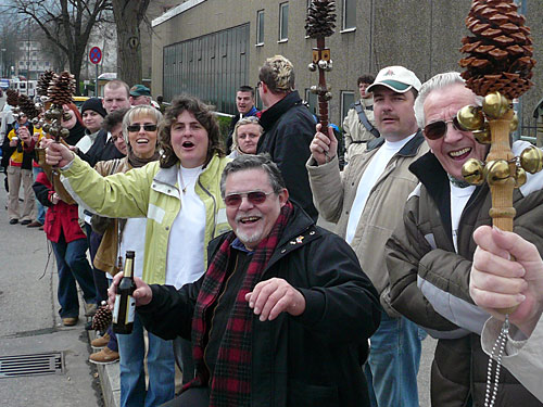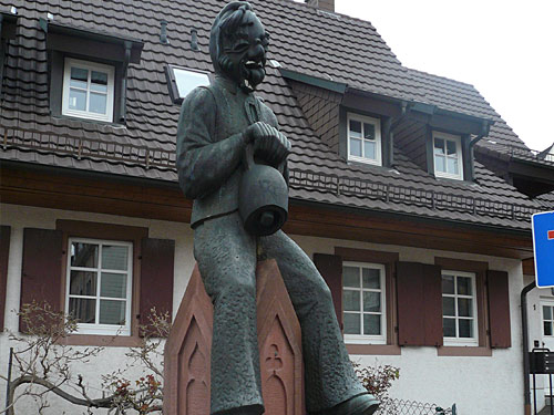 Dann queren wir den Fluß und laufen zurück in die Schloßbergstraße in der Altstadt und kommen in die Stadtteile Neuburg (km 14) und Herdern (km 15). Feiern scheint den Leuten hier im Blut zu liegen. Jedenfalls erreicht der Geräuschpegel Orkanstärke und die Stimmung könnte auch bei einer Fasnetveranstaltung nicht besser sein. Zur Fasnet nämlich scheinen die Leute hier eine sehr enge Beziehung zu haben, jedenfalls haben sie den Dorfbrunnen mit einem Hästräger geschmückt. Das ist in der Alemannischen Fasnet das Narrenkostüm, das aus einer geschnitzten Holzmaske und dem Narrenkleid besteht. Jede Narrenzunft hat ihr eigenes Häs, das der Träger ein Leben lang behält und meist weiter vererbt.