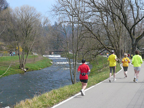 In der Kartäuserstraße (kurz vor km 10) haben wir eine kurze Begegnung mit den vor uns liegenden Läuferinnen und Läufern und kommen zum Flüsschen Dreisam, nach dem in Kreuzworträtseln oft gefragt wird. Ganz müssen wir auch hier nicht auf Musik und Zuschauerunterstützung verzichten, obwohl es schon etwas ruhiger ist. Richtig zum Genießen ist der Lauf entlang des Wassers und durch die herrlich blühenden Grünanlagen.