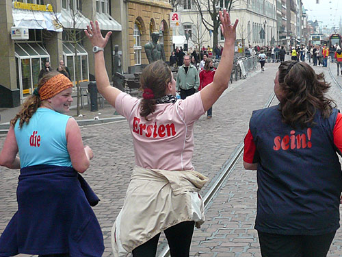 Nach dem Martinstor überhole ich drei Mädels. Sie haben nacheinander „die“, „Ersten“ und „sein“ rückseitig auf ihre Shirts gedruckt. Ich frage mich, was das soll und komme nicht drauf. Also erkundige ich mich. „Alles hat zwei Seiten, du musst auch von vorne lesen“, bekomme ich zur Antwort. Da wäre ich nicht drauf gekommen. Ich lese nach: „die“ „letzten“ „werden“ steht da. Aha, jetzt paßt es. Die Mädels haben ihren Spaß und ich weiß Bescheid.