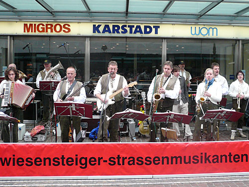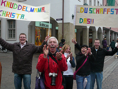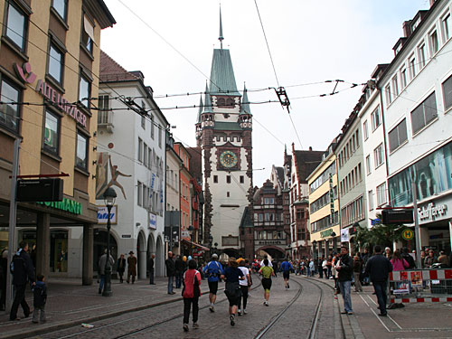 Nach dem engagierten Professor ist der Rotteckring benannt, der sich der Wilhelmstraße anschließt. Zweimal biegen wir danach rechts ab, dann sind wir auf der Freiburger Shopping-Meile, der Kaiser-Joseph-Straße (km 7). „Jetzt geht’s los“ spielen die Wiesensteiger Straßenmusikanten und das stimmt auch. Die Freiburger sind wieder total aus dem Häuschen und die feiern die Marathonis wie sonst nur ihren SC, wenn er wieder mal in die Bundesliga aufsteigt.