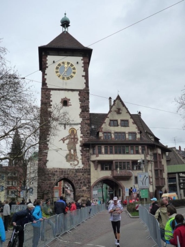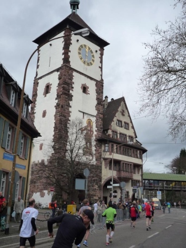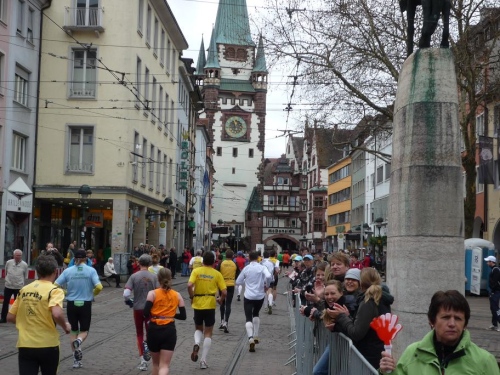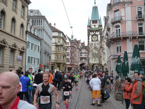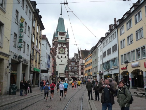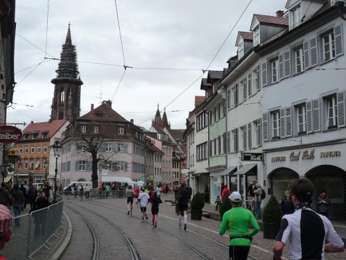 Bei km 7 ist es dann soweit: Die Kaiser-Joseph-Straße ist erreicht, die Einkaufs- und Flaniermeile Freiburgs schlechthin. Als zentrale Achse durchschneidet die „Große Gass“ bzw. „KaJo“ – wie sie je nach Einstellung badisch provinziell oder “weltstädtisch“ auch genannt wird – den historischen Stadtkern. Dichte Menschentrauben erwarten uns vor der mittelalterlichen Stadtkulisse, dazu stilistisch passend bewegen wir uns über holpriges Kopfsteinpflaster.