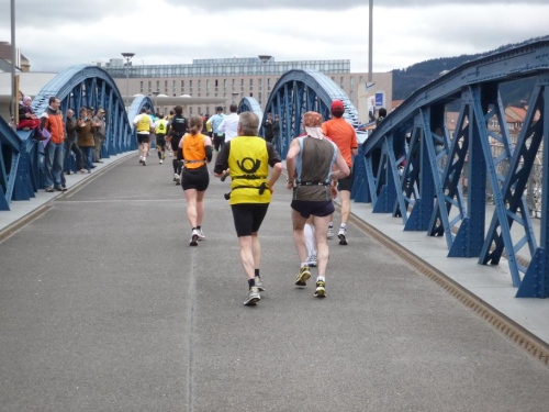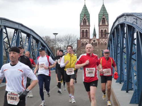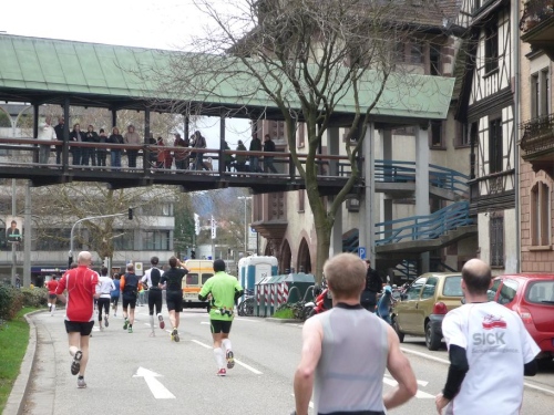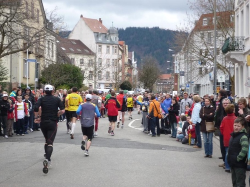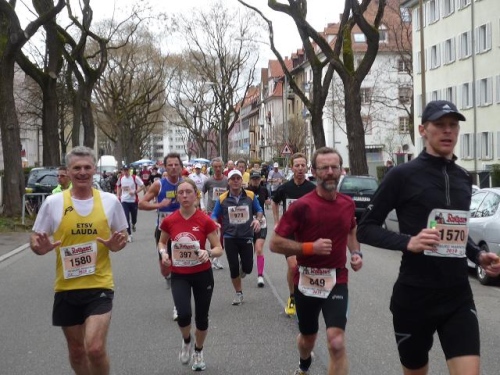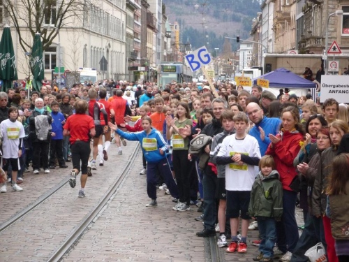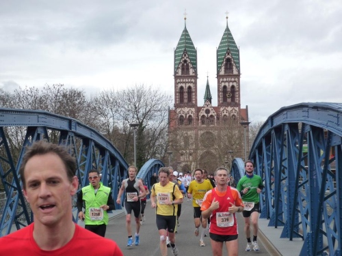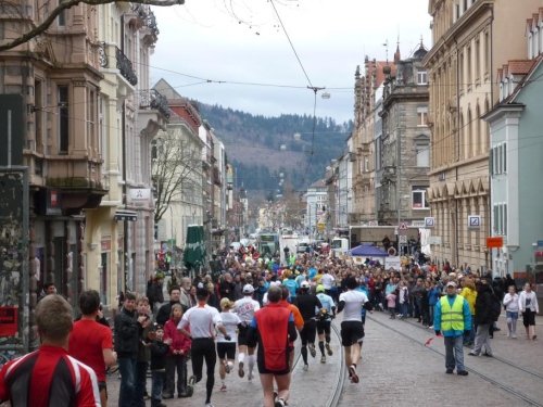 Über die Eschholzstraße erreichen wir, erneut die rauschende Dreisam querend, den Stadtteil Stühlinger und kurz darauf die 5 km-Marke. An der geschlossenen Bebauung merkt man, dass wir uns nun schon deutlich zentrumsnäher befinden. Auch die Dichte der Musikgruppen nimmt auffällig zu. Um die anschließende Wahl der besten Band zu erleichtern, ist jede Gruppe mit einer großen Nummer gekennzeichnet.