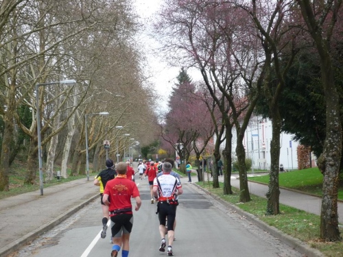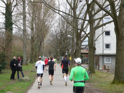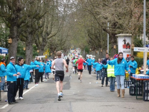 Lebhaft ist es insbesondere an den Verpflegungsstationen. Diese sind etwa alle 2,5 km beid-seitig der Strecke aufgebaut und bieten alternierend Wasser pur oder das volle Programm aus Wasser, Iso, bisweilen Tee, Bananen- und Energieriegelstücken, stets großzügig verteilt und nach gleichem Schema aufgebaut. Ein großes Lob an die vielen Helfer, die sehr aktiv und zuvorkommend die Läuferschaft umsorgen.