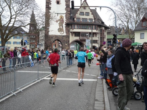 Die Sandfangbrücke kurz vor Km 12 bildet den Wendepunkt unseres Abstechers nach Oberau. Zum vierten Mal queren wir die Dreisam. Die Samba-Percussion-Truppe „Pulsando“ trommelt auf der anderen Uferseite zum Rückweg in Richtung Stadtzentrum. Wir folgen der langen Geraden der Kartäuserstraße, ehe wir etwa bei km 13,5 wieder die nun deutlich belebtere Begegnungsstrecke erreichen. Nun darf ich diese Passage aus der Perspektive desjenigen erleben, der schon ein paar Kilometer mehr in den Beinen hat. Und ich gebe ganz offen zu: diese Perspektive fühlt sich deutlich besser an!
