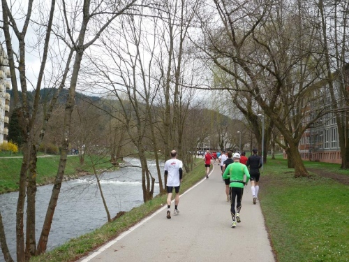 Nach der trubeligen Altstadt ist auf den nun folgenden Kilometern „Chill out“ angesagt. Unter hohen Bäumen folgen wir zunächst noch auf Straßen, dann über den Fritz-Horch-Weg dem Lauf der Dreisam durch die Natur in Richtung Osten. Die umgebenden Hügel rücken immer näher. Fast schon meditativ ist das Laufen in dieser ruhigen, entspannenden Umgebung. Ab und an preschen dynamische Jungspunde aus dem Staffelwettbewerb an mir vorbei, aber das ist auch die einzige Form von Unruhe entlang der Strecke.