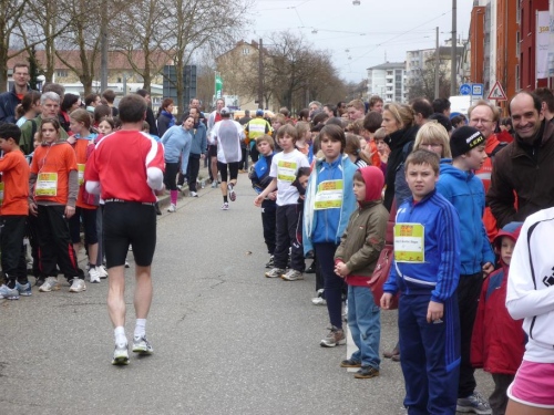 Auf einer Distanz von einigen hundert Metern ist nun Begegnungsstrecke angesagt. Uns kommen auf diesem Abschnitt diejenigen Läufer entgegen, die die folgende Schleife durch den Stadtteil Oberau schon hinter sich gebracht haben und damit um bis zu 4 km weiter sind. Auf der Gegenspur finde ich statt Begegnung aber zunächst nur gähnende Leere. Dann geht ein aufgeregtes Raunen durch die Reihen: Und siehe da: Ein kleines, dunkelhäutiges Männlein flitzt einsam und allein vorbei, begleitet von einer Welle des Applauses der ihm entgegen kommenden Läufer. Mir schwant schon, dass ich den designierten Sieger gesehen habe. Und so ist es auch: Der Kenianer mit dem wohlklingenden Namen Serem Philemon Kipketer wird nicht nur siegen, sondern auch mit 2:25:17 Std. einen neuen Streckenrekord aufstellen. Danach setzt sich die Leere auf der Gegenspur fort und erst kurz, bevor die Begegnungsstrecke endet, erblicke ich - deutlich gestresster wirkend - den zweitplatzierten Läufer.