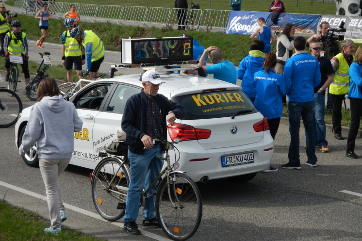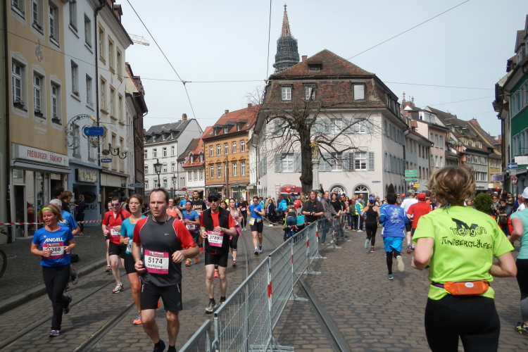 Da zwischen dem letzten und dem nächsten Verpflegungsposten sechs Kilometer liegen, ist auf halbem Weg dazwischen noch eine Wasserstation aufgebaut. Auf der Brücke zum anderen Ufer sorgt auf der Ladebrücke eines LKW eine Band für gute Stimmung, davor ist ein Paar fröhlich am Tanzen. Auf der Begegnungsstrecke hinauf zum Schwabentor ist nicht mehr viel Begegnung, dafür gleich nachdem der Torbogen durchschritten ist. Zudem ist von da aus auch der Münsterturm zu sehen.