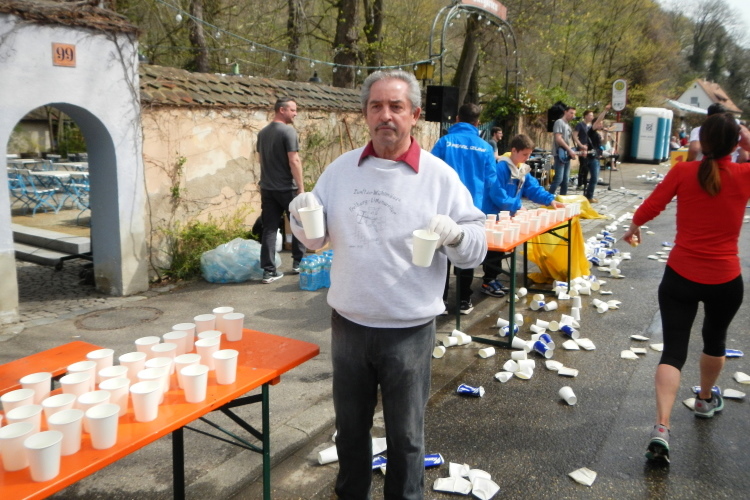 Unter einer Bahnlinie hindurch geht es ins Komponistenviertel. Die Straßen sind nach den Komponisten benannt, die ich den Schülern als minimalen Wissensstandard näher zu bringen versuche. Ist es Zufall, dass ich im Läuferfeld ausgerechnet beim Verpflegungsposten auf der Richard-Wagner-Straße Darth Vader entdecke?