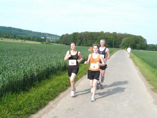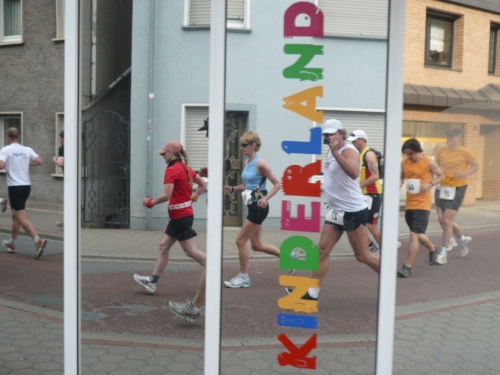 Eine halbe Stunde lang geht es in 2 Runden durch die Stadt, die immer noch so verschlafen ist, dass die Verkehrsabsperrungen eigentlich unnötig sind. Bei km 6 kommen aus einer Seitengasse die Teilnehmer des Schülerlaufs, die hellauf begeistert von uns Marathonläufern sind. Danach geht es für uns an der Strasse entlang Richtung Fröndenberg, es lässt sich hier gut auf dem Radweg laufen. Kurz vor der Ruhr geht es rechts rum, Richtung Schwitten, über wunderbare, asphaltierte Feldwege. Wir haben Spass am Laufen, das Wetter ist herrlich, die Landschaft ist schön, die Verpflegung perfekt, der Untergrund einwandfrei. Niemand ahnt zu dieser Zeit was sein wird, wenn wir ein zweites Mal diesen Teil laufen müssen.