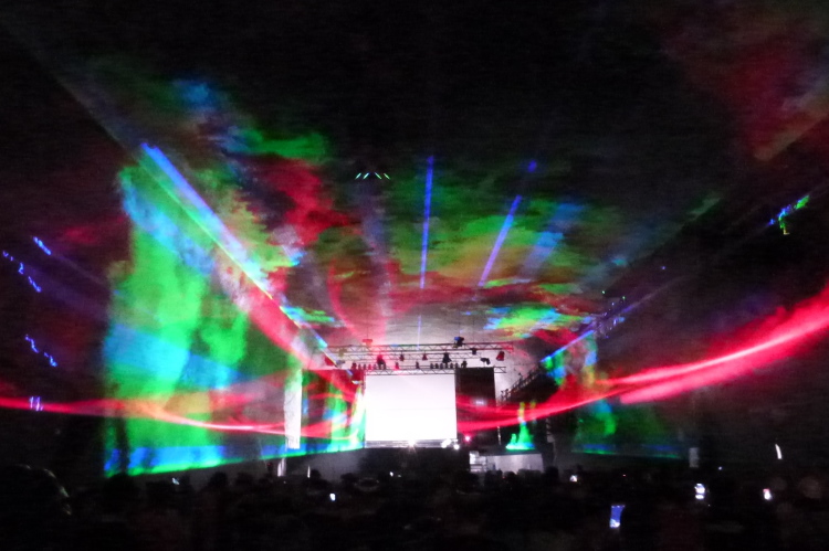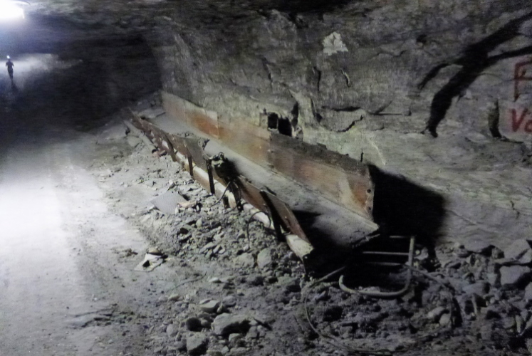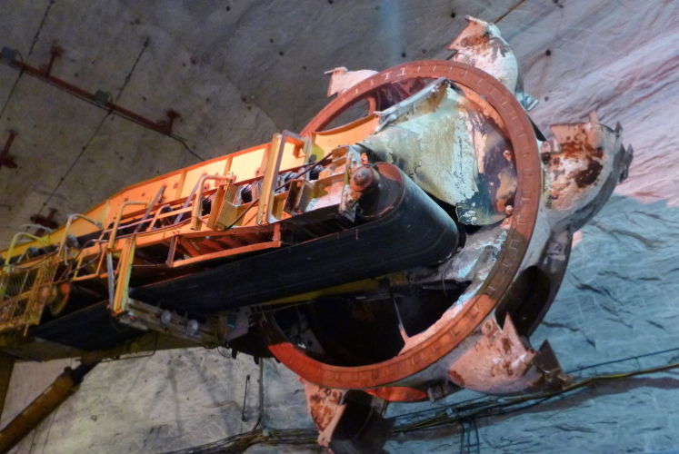 Im Anschluss an das zweiminütige Einfahren begrüßen uns neben 21° und 30% Luftfeuchtigkeit mehrere kleine Lkw, die uns nach dem Knipsen der hl. Barbara, Schutzpatronin der Bergleute, auf den dreireihigen Pritschen in atemberaubender Fahrt an den Ort des Geschehens bringen. Atemberaubend ist allerdings nur gefühlt, denn die geschätzte Geschwindigkeit von 80 km/h, mit der durch die Gänge gedüst wird, entpuppt sich auf Nachfrage als 35 km/h. Die Halle („Großbunker“), die unserer harrt, besticht durch ihre Größe und lässt keine Spur von Beklemmung aufkommen, zu meiner Beruhigung auch nicht bei einer bestimmten Dame. 250 m lang, 22 m breit und bis zu 17 m hoch diente sie (die Halle, nicht die Dame) früher der Zwischenlagerung von 50.000 t Rohsalz und beherbergt den weltweit größten unterirdischen Schaufelradbagger der Welt. Heute ist sie ein Konzertsaal mit besonders guter Akustik, wie man uns erzählt.
