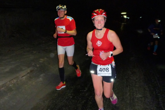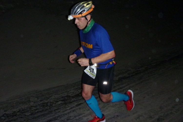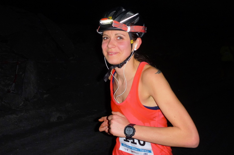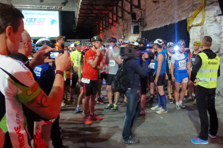 Markant ist auch der U-Turn am Ende der Gefällstrecke, wo man über einige Meter die entgegenkommenden Läufer begutachten kann. Gerne hätte ich auch mehr von ihnen erfolgreich auf Platte gebannt, aber das Fotografieren mit der zwar guten, aber dennoch kleinen und daher lichtschwachen Kamera gestaltet sich leider schwierig. Lichtschwach sind hingegen meine Augen nicht, denn die ordentliche Ausleuchtung der Stollen reicht mir völlig aus, die an meinem Fahrradhelm befestigte Hirnbirn habe ich nicht ein einziges Mal eingeschaltet. Wieder führt ein langer Weg bergab. Möglicherweise kommt daher Daniel Steiners Eindruck, hier gäbe es gefühlt mehr Gefälle als Steigungen, wie mir ein Laufkollege berichtet, der seinerzeit mit ihm unterwegs war. Dani, ich kann Dir sagen, Dein Eindruck hat getäuscht!