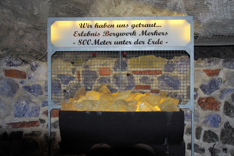 Geschichtlich hat uns das Bergwerk auch einiges zu erzählen: Seit 1925 wurde hier Kalisalz vornehmlich als Düngemittel, weniger als Speise- oder Abtausalz, abgebaut. Es hat ein Streckennetz von 4.600 km (!) und eine maximale Teufe von 860 m, wo es mit 28° richtig kuschelig ist. Seit 1991 dient es nur noch als Besucherbergwerk. International bekannt wurde es kurz vor Kriegsende 1945, als US-Truppen große Teile des Vermögens der Reichsbank in Form von Raubgold, Bargeld in Reichsmark und Kunstschätzen, darunter Bilder aus der Gemäldegalerie in Berlin oder die Büste der Nofretete in gesicherten Räumen des Bergwerks versteckt fanden. U.a. der spätere US-Präsident, General Dwight D. Eisenhower, fuhr im April 1945 in die Grube ein, um den Fund zu begutachten.