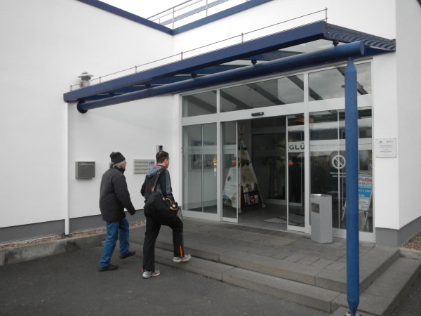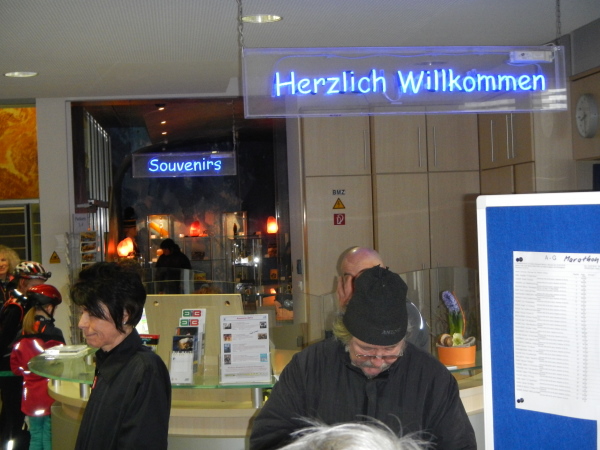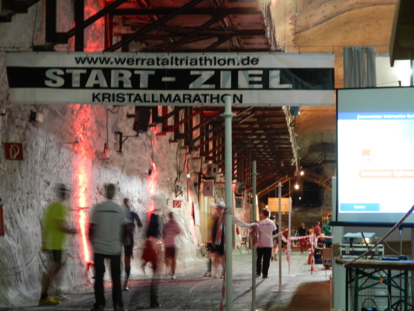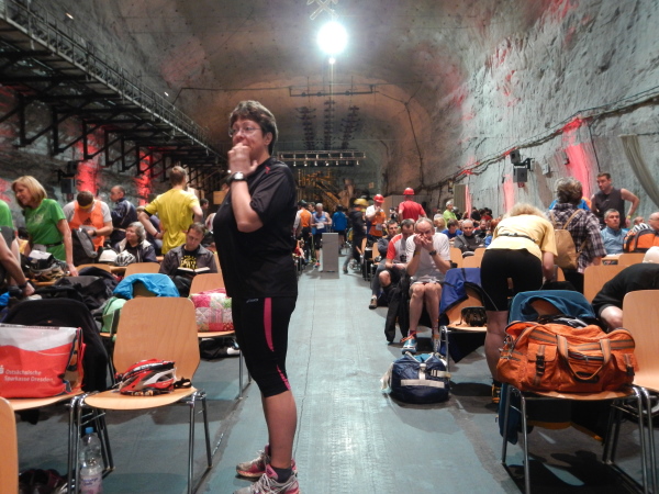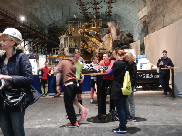 Beim Betreten des Besucherzentrums kann ich mich hinter der Tür gleich in die Warteschlange einreihen und treffe nebst den üblichen Verdächtigen den anderen Gesandten unserer Websites, den ich bisher noch nicht persönlich habe kennenlernen können. Günter ist im Gegensatz zu mir mit der Materie des Umfelds bekannt, in welchem der Kristallmarathon stattfindet, hat er in jungen Jahren doch auch untertage gearbeitet. Er wird für Marathon4you.de schreiben, ich bin für die „unbefestigte Schwester“ unterwegs. Das Motto von TRAILRUNNING.DE „Runter von der Straße“ nehme ich besonders ernst, denn es geht diesmal nicht nur runter, sondern auch über 500 Meter unter die Straße.