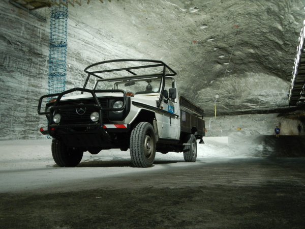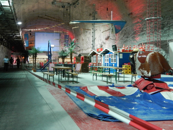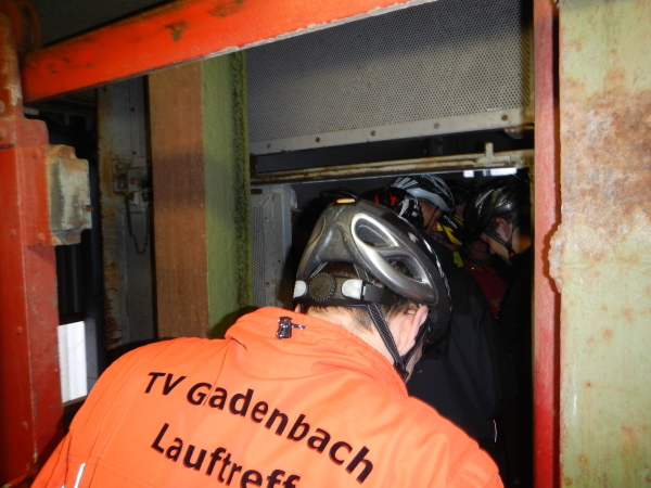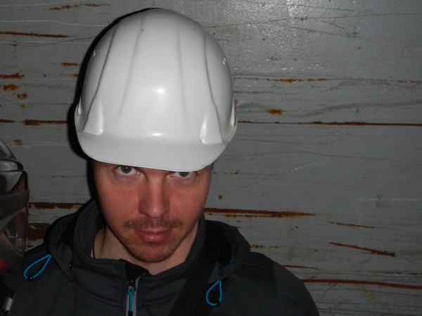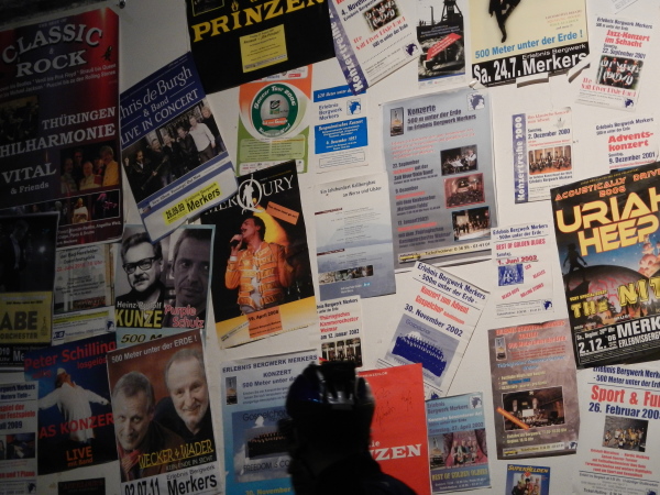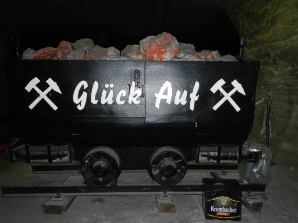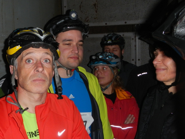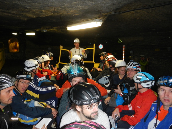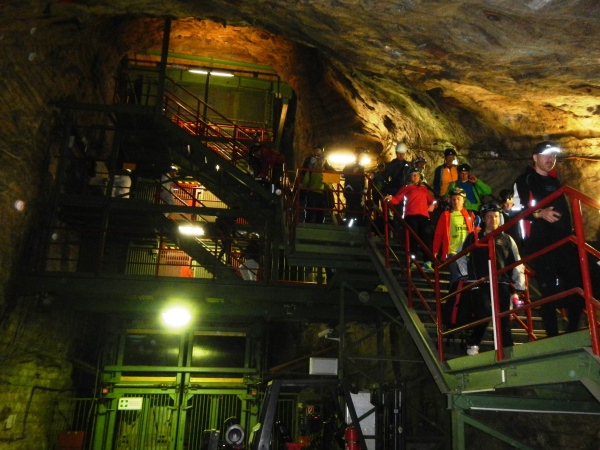 Für die Besucher ist selbstverständlich alles komfortabel hergerichtet worden, der dreistöckige Förderkorb kann gleichzeitig bestiegen werden und wer ein langes Rumpeln erwartet, wird überrascht, wie ruckelfrei wir in die Tiefe fahren. 8 Meter pro Sekunde geht es abwärts, hinunter auf die zweite Sohle. Hier werden wir zu den Transportern geführt, auf welchen wir in zügiger und zugiger Fahrt durch das Labyrinth auf die erste Sohle hochgebracht werden, wo im Großbunker gewissermaßen das Herz des Erlebnisbergwerks liegt.