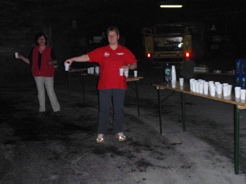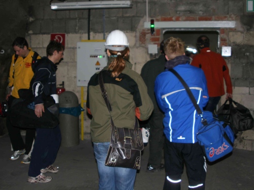 So musste ich die letzten drei Runden halt ohne Unterstützung angehen. Dabei fiel mir im Großbunker noch einmal die Plakate der hier stattfindenden Veranstaltungen ins Auge. Sogar Rüdiger Hoffman, Ostwestfale wie ich, war schon hier aufgetreten. Sein bedächtiger Humor erinnerte mich mittlerweile doch sehr an meine aktuelle Laufweise. An den Verpflegungsstellen war ich inzwischen auch auf Cola umgestiegen. So kam ich dann doch noch einmal frisch gestärkt ins Ziel, wo ich tatsächlich auf Silke warten musste. Das gab mir noch einmal die Gelegenheit, Angelika und Eberhard anzufeuern, die noch 2 Runden zu bewältigen hatten. Nach der anschließenden Ausfahrt wurden wir an der Oberfläche vom Orkantief „Xynthia“ begrüßt. Wie gut war es doch, dass dieser Marathon von solchen Wetterbedingungen unabhängig war.