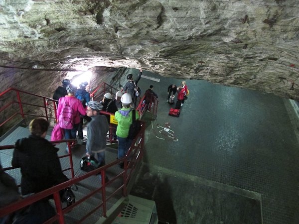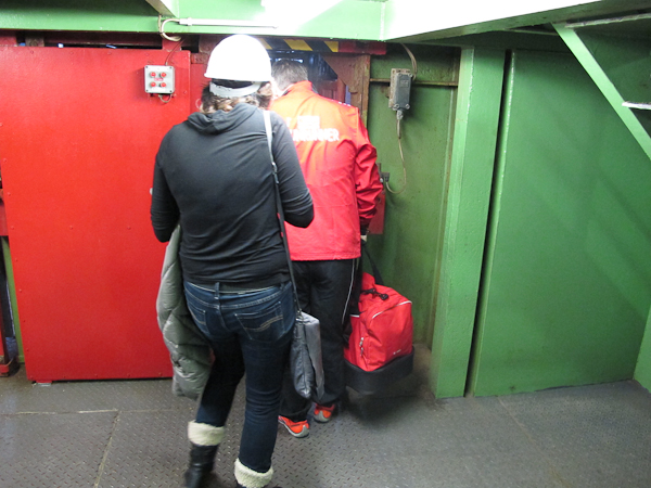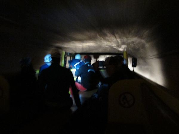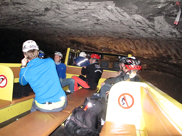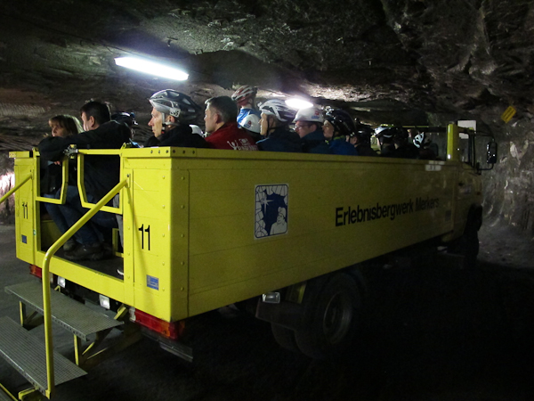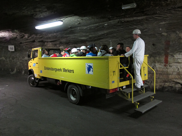 Um 9:45 Uhr führt die letzte Fahrt nach unten. Wir sind spät dran und gehören zu den letzten Läufern. Die Förderkörbe sind über zwei Etagen angelegt und können mit nur einer Seilfahrt zweimal 25 Personen fassen. Freundlich fordert uns ein Kumpel im weißen Bergmannsoutfit auf, Helme aufzusetzen; für viele ist das auch besser, denn die Decken sind niedrig. Dicht gedrängt stehen wir in dem Förderkorb, der früher die Bergmänner nach unten und das Salz nach oben brachte. Zwischen Himmel und Hölle liegen nur 60 Sekunden und 500 Meter Tiefe. Es ist stockdunkel und ich spüre den Druck in meinen Ohren. Je tiefer wir in den Berg einfahren, desto warmherziger wird die Atmosphäre. Probleme bekommen hier nur Klaustrophobiker. Meter für Meter entziehen wir uns der Winterkälte - von Null auf 21 Grad.